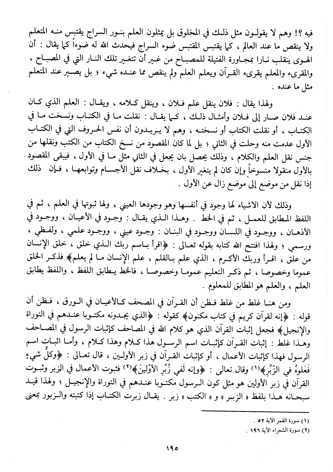 وَمن هُنَا غلط من غلط فَظن أَن الْقُرْآن فِي الْمُصحف كالأعيان فِي الْوَرق فَظن أَن قَوْله {إِنَّه لقرآن كريم فِي كتاب مَكْنُون} كَقَوْلِه {الَّذِي يجدونه مَكْتُوبًا عِنْدهم فِي التَّوْرَاة وَالْإِنْجِيل} فَجعل إِثْبَات الْقُرْآن الَّذِي هُوَ كَلَام الله فِي الْمَصَاحِف كإثبات الرَّسُول فِي الْمَصَاحِف وَهَذَا غلط إِثْبَات الْقُرْآن كإثبات اسْم الرَّسُول هَذَا كَلَام وَهَذَا كَلَام وَأما إِثْبَات اسْم الرَّسُول فَهَذَا كإثبات الْأَعْمَال أَو كإثبات الْقُرْآن فِي زبر الْأَوَّلين قَالَ تَعَالَى {وكل شَيْء فَعَلُوهُ فِي الزبر} وَقَالَ تَعَالَى {وَإنَّهُ لفي زبر الْأَوَّلين} فثبوت الْأَعْمَال فِي الزبر وَثُبُوت الْقُرْآن فِي زبر الْأَوَّلين هُوَ مثل كَون الرَّسُول مَكْتُوبًا عِنْدهم فِي التَّوْرَاة وَالْإِنْجِيل وَلِهَذَا قيد سُبْحَانَهُ هَذَا بِلَفْظ الزبر والكتب زبر يُقَال زبرت الْكتاب إِذا كتبته وَالزَّبُور بِمَعْنى