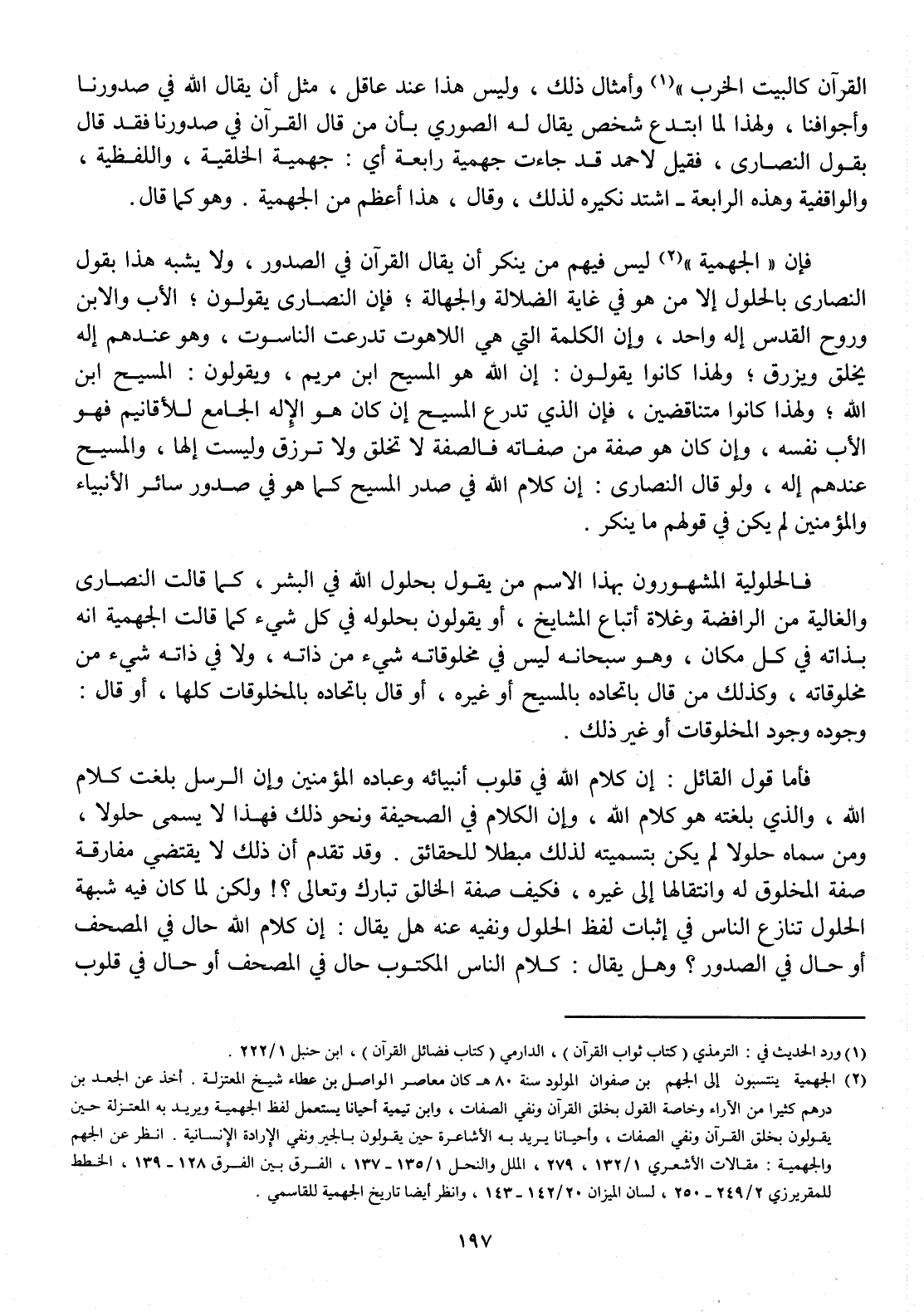 فَإِن الْجَهْمِية لَيْسَ فيهم من يُنكر أَن يُقَال الْقُرْآن فِي الصُّدُور وَلَا يشبه هَذَا بقول النَّصَارَى بالحلول إِلَّا من هُوَ فِي غَايَة الضَّلَالَة والجهالة فَإِن النَّصَارَى يَقُولُونَ الْأَب وَالِابْن وروح الْقُدس إِلَه وَاحِد وَإِن الْكَلِمَة الَّتِي هِيَ اللاهوت تدرعت الناسوت وَهُوَ عِنْدهم إِلَه يخلق ويرزق وَلِهَذَا كَانُوا يَقُولُونَ إِن الله هُوَ الْمَسِيح ابْن مَرْيَم وَيَقُولُونَ الْمَسِيح ابْن الله وَلِهَذَا كَانُوا متناقضين فَإِن الَّذِي تدرع الْمَسِيح إِن كَانَ هُوَ الْإِلَه الْجَامِع للأقانيم فَهُوَ الْأَب نَفسه وَإِن كَانَ هُوَ صفة من صِفَاته فالصفة لَا تخلق وَلَا ترزق وَلَيْسَت إِلَهًا والمسيح عِنْدهم إِلَه وَلَو قَالَ النَّصَارَى إِن كَلَام الله فِي صدر الْمَسِيح كَمَا هُوَ فِي صُدُور سَائِر الْأَنْبِيَاء وَالْمُؤمنِينَ لم يكن فِي قَوْلهم مَا يُنكر