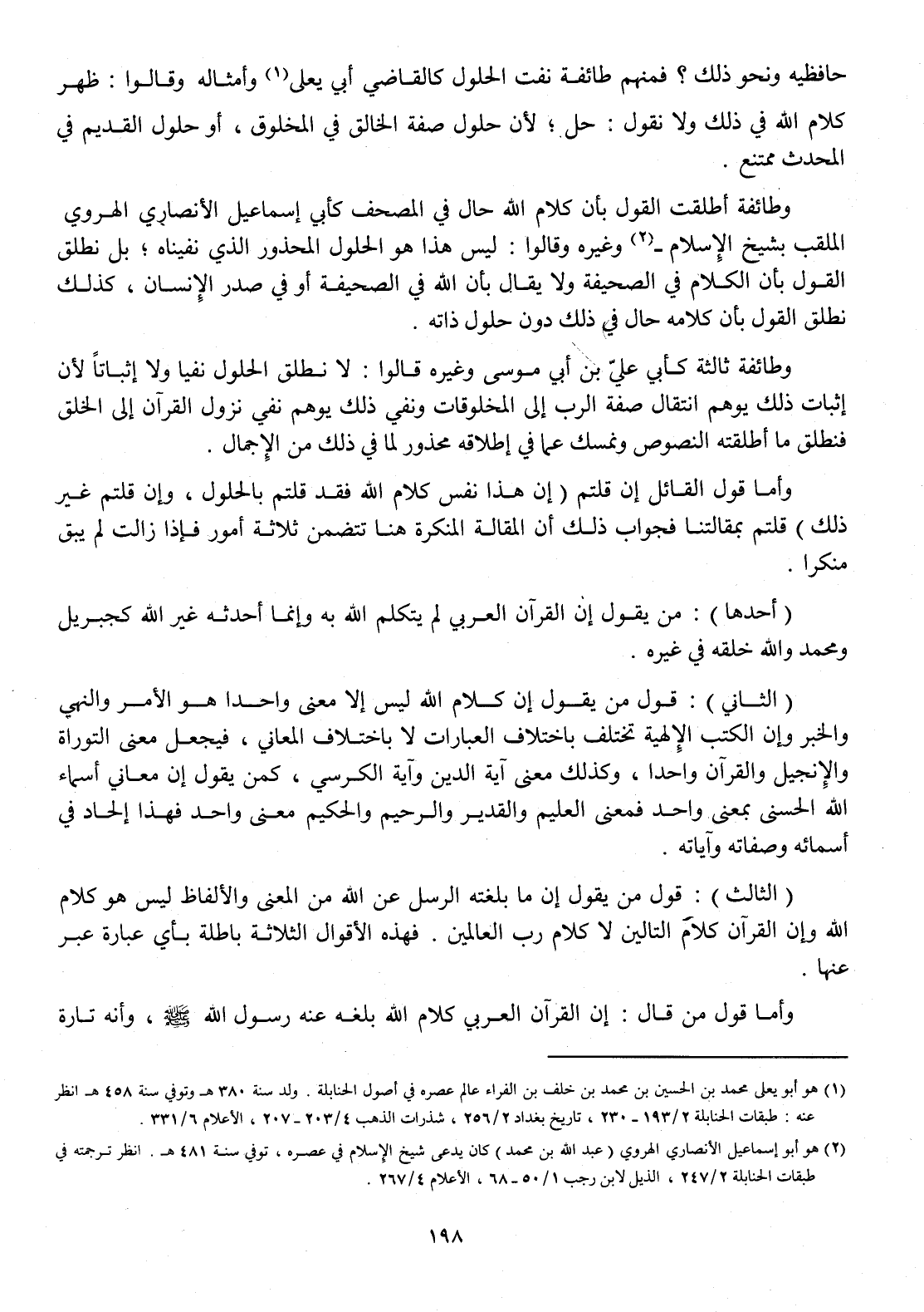 حافظيه وَنَحْو ذَلِك فَمنهمْ طَائِفَة نفت الْحُلُول كَالْقَاضِي أبي يعلى وَأَمْثَاله وَقَالُوا ظهر كَلَام الله فِي ذَلِك وَلَا نقُول حل لِأَن حُلُول صفة الْخَالِق فِي الْمَخْلُوق أَو حُلُول الْقَدِيم فِي الْمُحدث مُمْتَنع