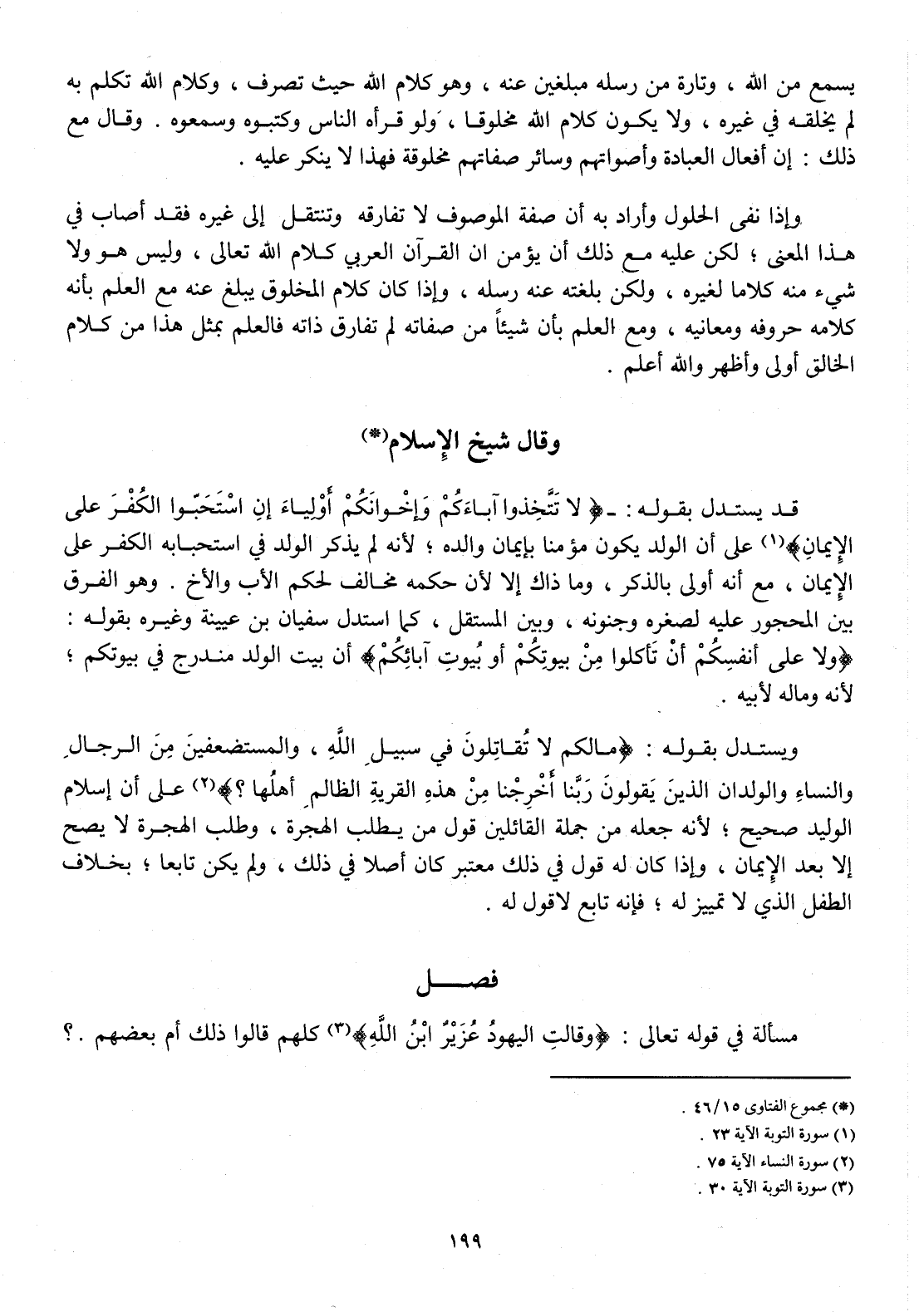 وَإِذا نفى الْحُلُول وَأَرَادَ بِهِ أَن صفة الْمَوْصُوف لَا تُفَارِقهُ وتنتقل إِلَى غَيره فقد أصَاب فِي هَذَا الْمَعْنى لَكِن عَلَيْهِ مَعَ ذَلِك أَن يُؤمن أَن الْقُرْآن الْعَرَبِيّ كَلَام الله تَعَالَى وَلَيْسَ هُوَ وَلَا شَيْء مِنْهُ كلَاما لغيره وَلَكِن بلغته عَنهُ رسله وَإِذا كَانَ كَلَام الْمَخْلُوق يبلغ عَنهُ مَعَ الْعلم بِأَنَّهُ كَلَامه حُرُوفه ومعانيه وَمَعَ الْعلم بِأَن شَيْئا من صِفَاته لم تفارق ذَاته فالعلم بِمثل هَذَا من كَلَام الْخَالِق أولى وَأظْهر وَالله أعلم