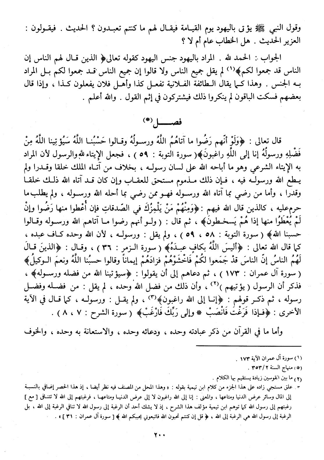 قَالَ تَعَالَى {وَلَو أَنهم رَضوا مَا آتَاهُم الله وَرَسُوله وَقَالُوا حَسبنَا الله سيؤتينا الله من فَضله وَرَسُوله إِنَّا إِلَى الله راغبون} سُورَة التَّوْبَة 59 فَجعل الإيتاء لله وَالرَّسُول لِأَن المُرَاد بِهِ الإيتاء الشَّرْعِيّ وَهُوَ مَا أَبَاحَهُ الله على لِسَان رَسُوله بِخِلَاف مَا آتَاهُ الْملك خلقا وَقدرا وَلم يطع الله وَرَسُوله فِيهِ فَإِن ذَلِك مَذْمُوم مُسْتَحقّ للعقاب وَإِن كَانَ قد آتَاهُ الله ذَلِك خلقا وَقدرا وَأما من رَضِي بِمَا آتَاهُ الله وَرَسُوله فَهُوَ مِمَّن رَضِي بِمَا أحله الله وَرَسُوله وَلم يطْلب مَا حرم عَلَيْهِ كَالَّذِين قَالَ الله فيهم {وَمِنْهُم من يَلْمِزك فِي الصَّدقَات فَإِن أعْطوا مِنْهَا رَضوا وَإِن لم يُعْطوا مِنْهَا إِذا هم يسخطون} ثمَّ قَالَ {وَلَو أَنهم رَضوا مَا آتَاهُم الله وَرَسُوله وَقَالُوا حَسبنَا الله} سُورَة التَّوْبَة 58 59 وَلم يقل وَرَسُوله لِأَن الله وَحده كَاف عَبده كَمَا قَالَ الله تَعَالَى {أَلَيْسَ الله بكاف عَبده} سُورَة الزمر 36 وَقَالَ {الَّذين قَالَ لَهُم النَّاس إِن النَّاس قد جمعُوا لكم فَاخْشَوْهُمْ فَزَادَهُم إِيمَانًا وَقَالُوا حَسبنَا الله وَنعم الْوَكِيل} سُورَة آل عمرَان 173 ثمَّ دعاهم إِلَى أَن يَقُولُوا {سيؤتينا الله من فَضله وَرَسُوله} فَذكر أَن الرَّسُول يُؤْتِيهم وَأَن ذَلِك من فضل الله وَحده لم يقل من فَضله وَفضل رَسُوله ثمَّ ذكر قَوْله {إِنَّا إِلَى الله راغبون} وَلم يقل وَرَسُوله كَمَا قَالَ فِي الْآيَة الْأُخْرَى {فَإِذا فرغت فانصب وَإِلَى رَبك فارغب} سُورَة الشَّرْح 7 8