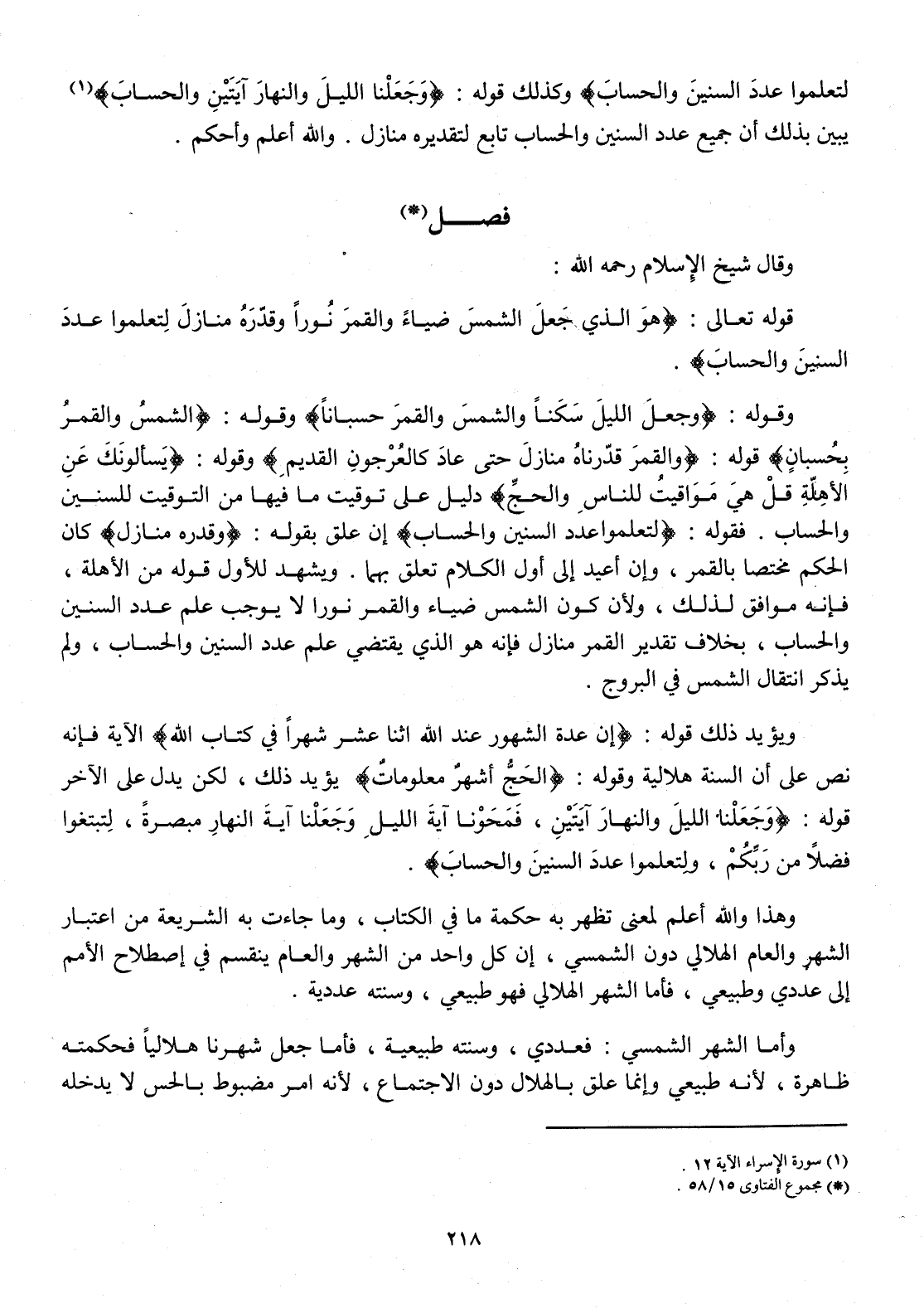 وَقَوله {وَجعل اللَّيْل سكنا وَالشَّمْس وَالْقَمَر حسبانا} وَقَوله {الشَّمْس وَالْقَمَر بحسبان} قَوْله {وَالْقَمَر قدرناه منَازِل حَتَّى عَاد كالعرجون الْقَدِيم} وَقَوله {يَسْأَلُونَك عَن الْأَهِلّة قل هِيَ مَوَاقِيت للنَّاس وَالْحج} دَلِيل على تَوْقِيت مَا فِيهَا من التَّوْقِيت للسنين والحساب فَقَوله {لِتَعْلَمُوا عدد السنين والحساب} إِن علق بقوله {وَقدره منَازِل} كَانَ الحكم مُخْتَصًّا بالقمر وَإِن أُعِيد إِلَى أول الْكَلَام تعلق بهما وَيشْهد للْأولِ قَوْله من الْأَهِلّة فَإِنَّهُ مُوَافق لذَلِك وَلِأَن كَون الشَّمْس ضِيَاء وَالْقَمَر نورا لَا يُوجب علم عدد السنين والحساب بِخِلَاف تَقْدِير الْقَمَر منَازِل فَإِنَّهُ هُوَ الَّذِي يَقْتَضِي علم عدد السنين والحساب وَلم يذكر انْتِقَال الشَّمْس فِي البروج