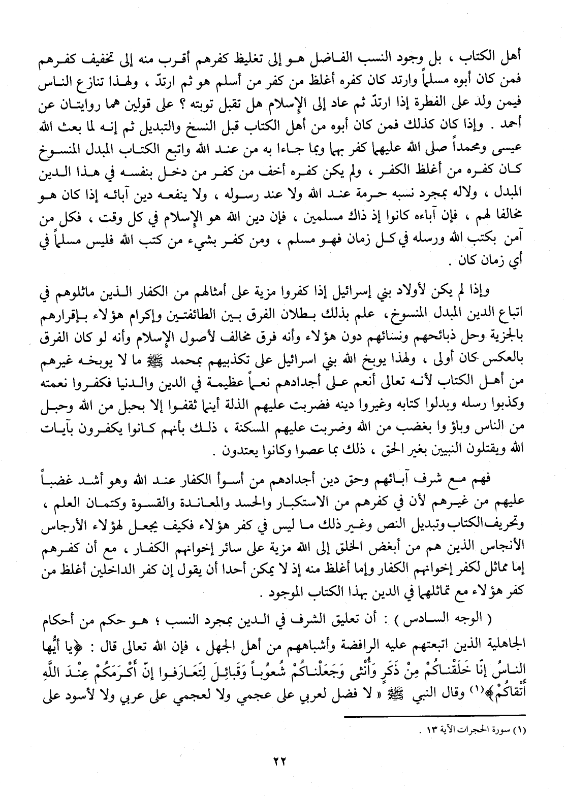 أهل الْكتاب بل وجود النّسَب الْفَاضِل هُوَ إِلَى تَغْلِيظ كفرهم أقرب مِنْهُ إِلَى تَخْفيف كفرهم فَمن كَانَ أَبوهُ مُسلما وارتد كَانَ كفره أغْلظ من كفر من أسلم هُوَ ثمَّ ارْتَدَّ وَلِهَذَا تنَازع النَّاس فِيمَن ولد على الْفطْرَة إِذا ارْتَدَّ ثمَّ عَاد إِلَى الْإِسْلَام هَل تقبل تَوْبَته على قَوْلَيْنِ هما رِوَايَتَانِ عَن أَحْمد وَإِذا كَانَ كَذَلِك فَمن كَانَ أَبوهُ من أهل الْكتاب قبل النّسخ والتبديل ثمَّ إِنَّه لما بعث الله عِيسَى ومحمدا صلى الله عَلَيْهِمَا كفر بهما وَبِمَا جَاءَا بِهِ من عِنْد الله وَاتبع الْكتاب الْمُبدل الْمَنْسُوخ كَانَ كفره من أغْلظ الْكفْر وَلم يكن كفره أخف من كفر من دخل بِنَفسِهِ فِي هَذَا الدّين الْمُبدل وَلَا لَهُ بِمُجَرَّد نسبه حُرْمَة عِنْد الله وَلَا عِنْد رَسُوله وَلَا يَنْفَعهُ دين آبَائِهِ إِذا كَانَ هُوَ مُخَالفا لَهُم فَإِن آباءه كَانُوا إِذْ ذَاك مُسلمين فَإِن دين الله هُوَ الْإِسْلَام فِي كل وَقت فَكل من آمن بكتب الله وَرُسُله فِي كل زمَان فَهُوَ مُسلم وَمن كفر بِشَيْء من كتب الله فَلَيْسَ مُسلما فِي أَي زمَان كَانَ