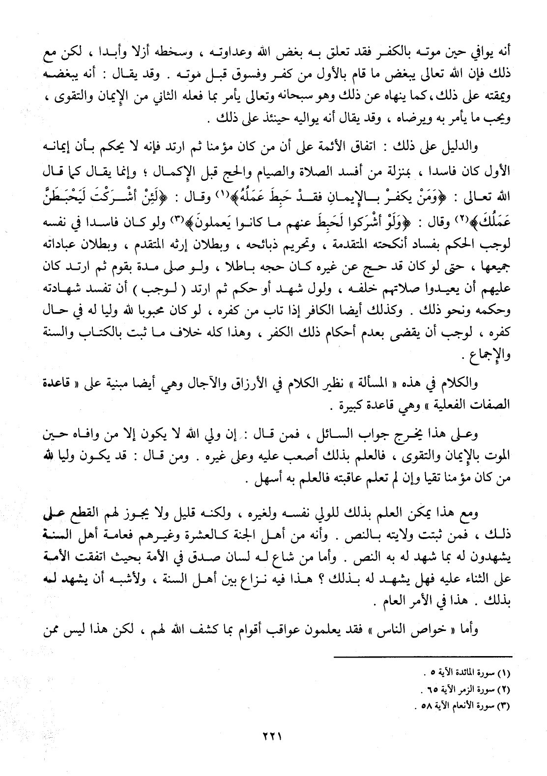 وَالدَّلِيل على ذَلِك اتِّفَاق الْأَئِمَّة على أَن من كَانَ مُؤمنا ثمَّ ارْتَدَّ فَإِنَّهُ لَا يحكم بِأَن إيمَانه الأول كَانَ فَاسِدا بِمَنْزِلَة من أفسد الصَّلَاة وَالصِّيَام وَالْحج قبل الْإِكْمَال وَإِنَّمَا يُقَال كَمَا قَالَ الله تَعَالَى {وَمن يكفر بِالْإِيمَان فقد حَبط عمله} وَقَالَ {لَئِن أشركت ليحبطن عَمَلك} وَقَالَ {وَلَو أشركوا لحبط عَنْهُم مَا كَانُوا يعْملُونَ} وَلَو كَانَ فَاسِدا فِي نَفسه لوَجَبَ الحكم بِفساد أنكحته الْمُتَقَدّمَة وَتَحْرِيم ذبائحه وَبطلَان إِرْثه الْمُتَقَدّم وَبطلَان عباداته جَمِيعهَا حَتَّى لَو كَانَ قد حج عَن غَيره كَانَ حجه بَاطِلا وَلَو صلى مُدَّة بِقوم ثمَّ ارْتَدَّ كَانَ عَلَيْهِم أَن يُعِيدُوا صلَاتهم خَلفه وَلَو شهد أَو حكم ثمَّ ارْتَدَّ لوَجَبَ أَن تفْسد صلَاته وَحكمه وَنَحْو ذَلِك وَكَذَلِكَ أَيْضا الْكَافِر إِذا تَابَ من كفره لَو كَانَ محبوبا لله وليا لَهُ فِي حَال كفره لوَجَبَ أَن يقْضِي بِعَدَمِ أَحْكَام ذَلِك الْكفْر وَهَذَا كُله خلاف مَا ثَبت بِالْكتاب وَالسّنة وَالْإِجْمَاع
