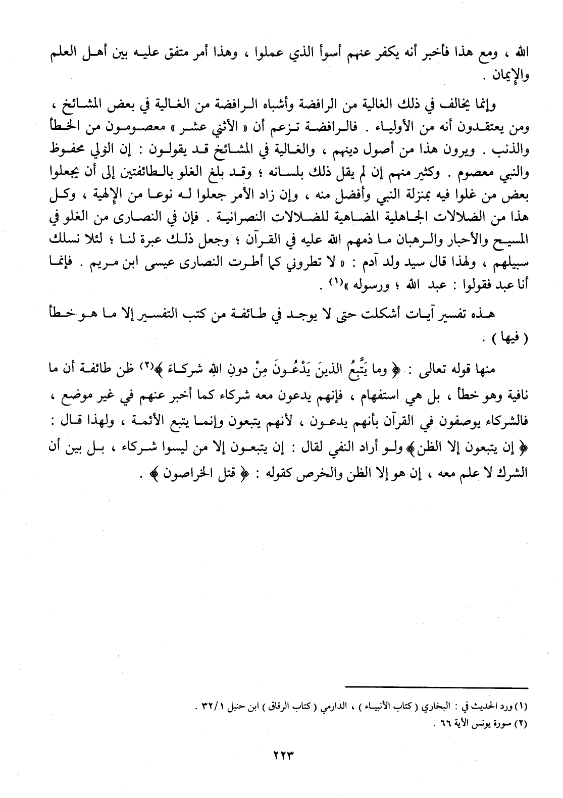 وَإِنَّمَا يُخَالف فِي ذَلِك الغالية من الرافضة وَأَشْبَاه الرافضة من الغالية فِي بعض المشائخ وَمن يَعْتَقِدُونَ أَنه من الْأَوْلِيَاء فالرافضة تزْعم أَن الأثني عشر معصومون من الْخَطَأ والذنب ويرون هَذَا من أصُول دينهم والغالية فِي المشائخ قد يَقُولُونَ إِن الْوَلِيّ مَحْفُوظ وَالنَّبِيّ مَعْصُوم وَكثير مِنْهُم إِن لم يقل ذَلِك بِلِسَانِهِ وَقد بلغ الغلو بالطائفتين إِلَى أَن يجْعَلُوا بعض من غلوا فِيهِ بِمَنْزِلَة النَّبِي وَأفضل مِنْهُ وَإِن زَاد الْأَمر جعلُوا لَهُ نوعا من الإلهية وكل هَذَا من الضلالات الْجَاهِلِيَّة المضاهية للضلالات النَّصْرَانِيَّة فَإِن فِي النَّصَارَى من الغلو فِي الْمَسِيح والأحبار والرهبان مَا ذمهم الله عَلَيْهِ فِي الْقُرْآن وَجعل ذَلِك عِبْرَة لنا لِئَلَّا نسلك سبيلهم وَلِهَذَا قَالَ سيد ولد آدم لَا تطروني كَمَا أطرت النَّصَارَى عِيسَى ابْن مَرْيَم فَإِنَّمَا أَنا عبد فَقولُوا عبد الله وَرَسُوله