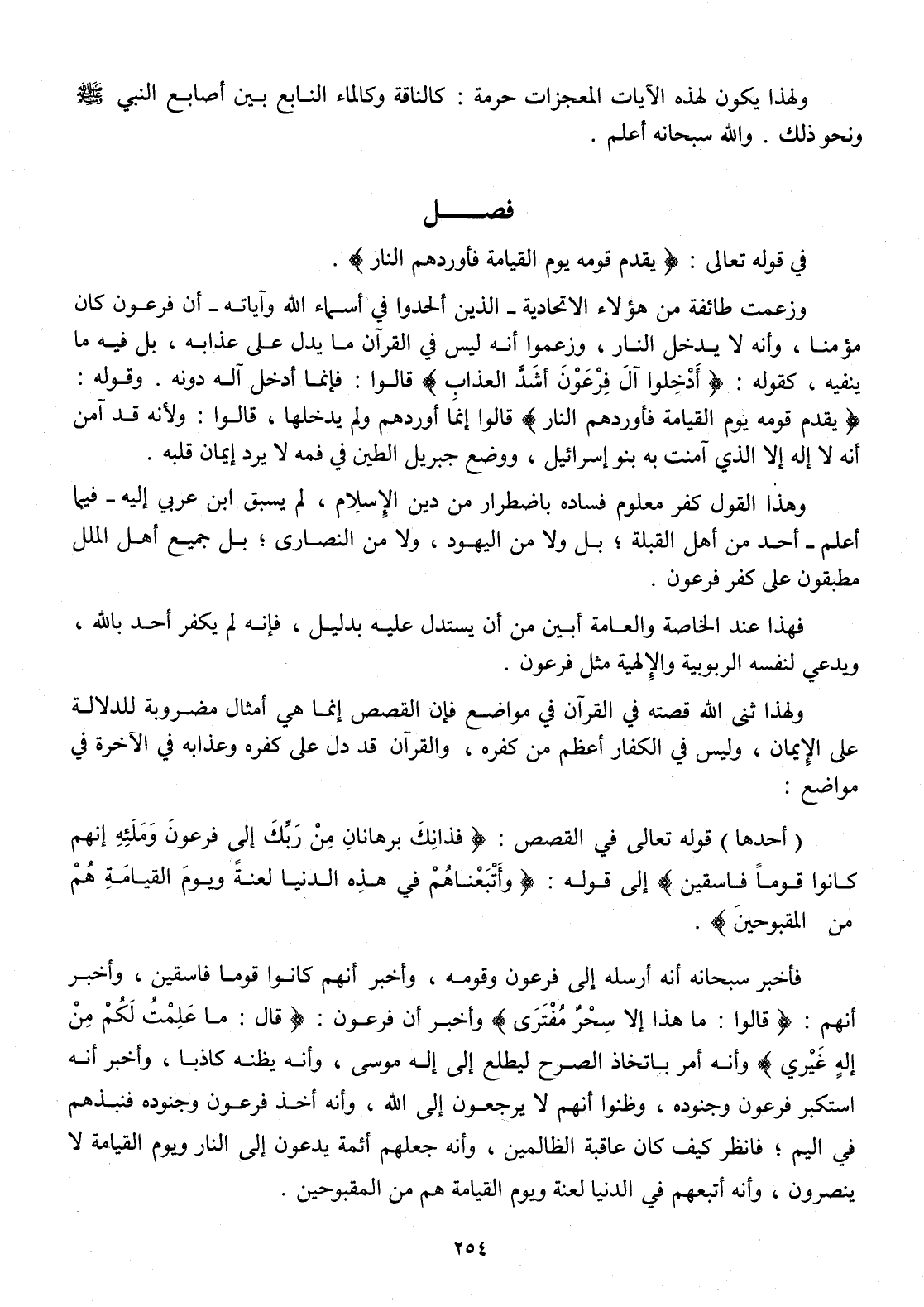وَهَذَا القَوْل كفر مَعْلُوم فَسَاده باضطرار من دين الْإِسْلَام لم يسْبق ابْن عَرَبِيّ إِلَيْهِ فِيمَا أعلم أحد من أهل الْقبْلَة بل وَلَا من الْيَهُود وَلَا من النَّصَارَى بل جَمِيع أهل الْملَل مطبقون على كفر فِرْعَوْن