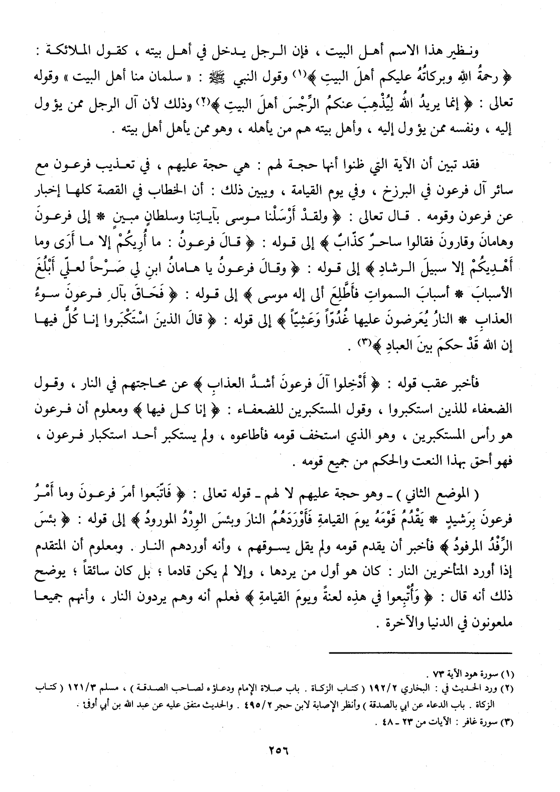 فقد تبين أَن الْآيَة الَّتِي ظنُّوا أَنَّهَا حجَّة لَهُم هِيَ حجَّة عَلَيْهِم فِي تَعْذِيب فِرْعَوْن مَعَ سَائِر آل فِرْعَوْن فِي البرزخ وَفِي يَوْم الْقِيَامَة وَيبين ذَلِك أَن الْخطاب فِي الْقِصَّة كلهَا إِخْبَار عَن فِرْعَوْن وَقَومه قَالَ تَعَالَى {وَلَقَد أرسلنَا مُوسَى بِآيَاتِنَا وسلطان مُبين إِلَى فِرْعَوْن وهامان وَقَارُون فَقَالُوا سَاحر كَذَّاب} إِلَى قَوْله {قَالَ فِرْعَوْن مَا أريكم إِلَّا مَا أرى وَمَا أهديكم إِلَّا سَبِيل الرشاد} إِلَى قَوْله {وَقَالَ فِرْعَوْن يَا هامان ابْن لي صرحا لعَلي أبلغ الْأَسْبَاب أَسبَاب السَّمَاوَات فَأطلع إِلَى إِلَه مُوسَى} إِلَى قَوْله {وحاق بآل فِرْعَوْن سوء الْعَذَاب النَّار يعرضون عَلَيْهَا غدوا وعشيا} إِلَى قَوْله {قَالَ الَّذين استكبروا إِنَّا كل فِيهَا إِن الله قد حكم بَين الْعباد}