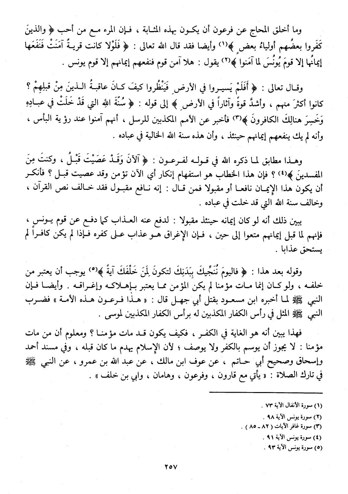 وَقَوله بعد هَذَا {فاليوم ننجيك ببدنك لتَكون لمن خَلفك آيَة} يُوجب أَن يعْتَبر من خَلفه وَلَو كَانَ إِنَّمَا مَاتَ مُؤمنا لم يكن الْمُؤمن مِمَّا يعْتَبر بإهلاكه وإغراقه وَأَيْضًا فَإِن النَّبِي صلى الله عَلَيْهِ وَسلم لما أخبرهُ ابْن مَسْعُود بقتل أبي جهل قَالَ هَذَا فِرْعَوْن هَذِه الْأمة فَضرب النَّبِي صلى الله عَلَيْهِ وَسلم الْمثل فِي رَأس الْكفَّار المكذبين لَهُ بِرَأْس الْكفَّار المكذبين لمُوسَى