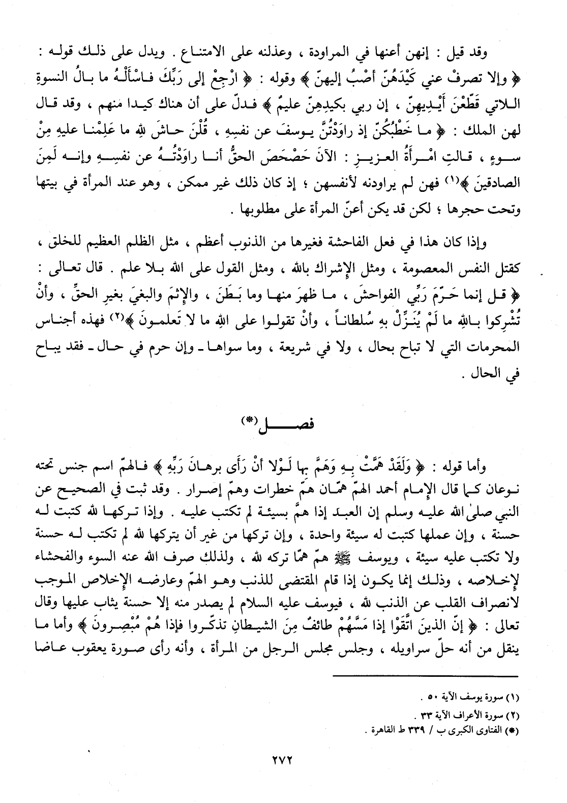 وَأما قَوْله {وَلَقَد هَمت بِهِ وهم بهَا لَوْلَا أَن رأى برهَان ربه} فالهم اسْم جنس تَحْتَهُ نَوْعَانِ كَمَا قَالَ الإِمَام أَحْمد الْهم همان هم خطرات وهم إِصْرَار وَقد ثَبت فِي الصَّحِيح عَن النَّبِي صلى الله عَلَيْهِ وَسلم إِن العَبْد إِذا هم بسيئة لم تكْتب عَلَيْهِ وَإِذا تَركهَا لله كتبت لَهُ حَسَنَة وَإِن عَملهَا كتبت لَهُ سَيِّئَة وَاحِدَة وَإِن تَركهَا من غير أَن يَتْرُكهَا لله لم تكْتب لَهُ حَسَنَة وَلَا تكْتب عَلَيْهِ سَيِّئَة ويوسف صلى الله عَلَيْهِ وَسلم هم هما تَركه لله وَلذَلِك صرف الله عَنهُ السوء والفحشاء لإخلاصه وَذَلِكَ إِنَّمَا يكون إِذا قَامَ الْمُقْتَضى للذنب وَهُوَ الْهم وعارضه الْإِخْلَاص الْمُوجب لانصراف الْقلب عَن الذَّنب لله فيوسف عَلَيْهِ السَّلَام لم يصدر مِنْهُ إِلَّا حَسَنَة يُثَاب عَلَيْهَا وَقَالَ تَعَالَى {إِن الَّذين اتَّقوا إِذا مسهم طائف من الشَّيْطَان تَذكرُوا فَإِذا هم مبصرون} وَأما مَا ينْقل من أَنه حل سراويله وَجلسَ مجْلِس الرجل من الْمَرْأَة وَأَنه رأى صُورَة يَعْقُوب عاضا