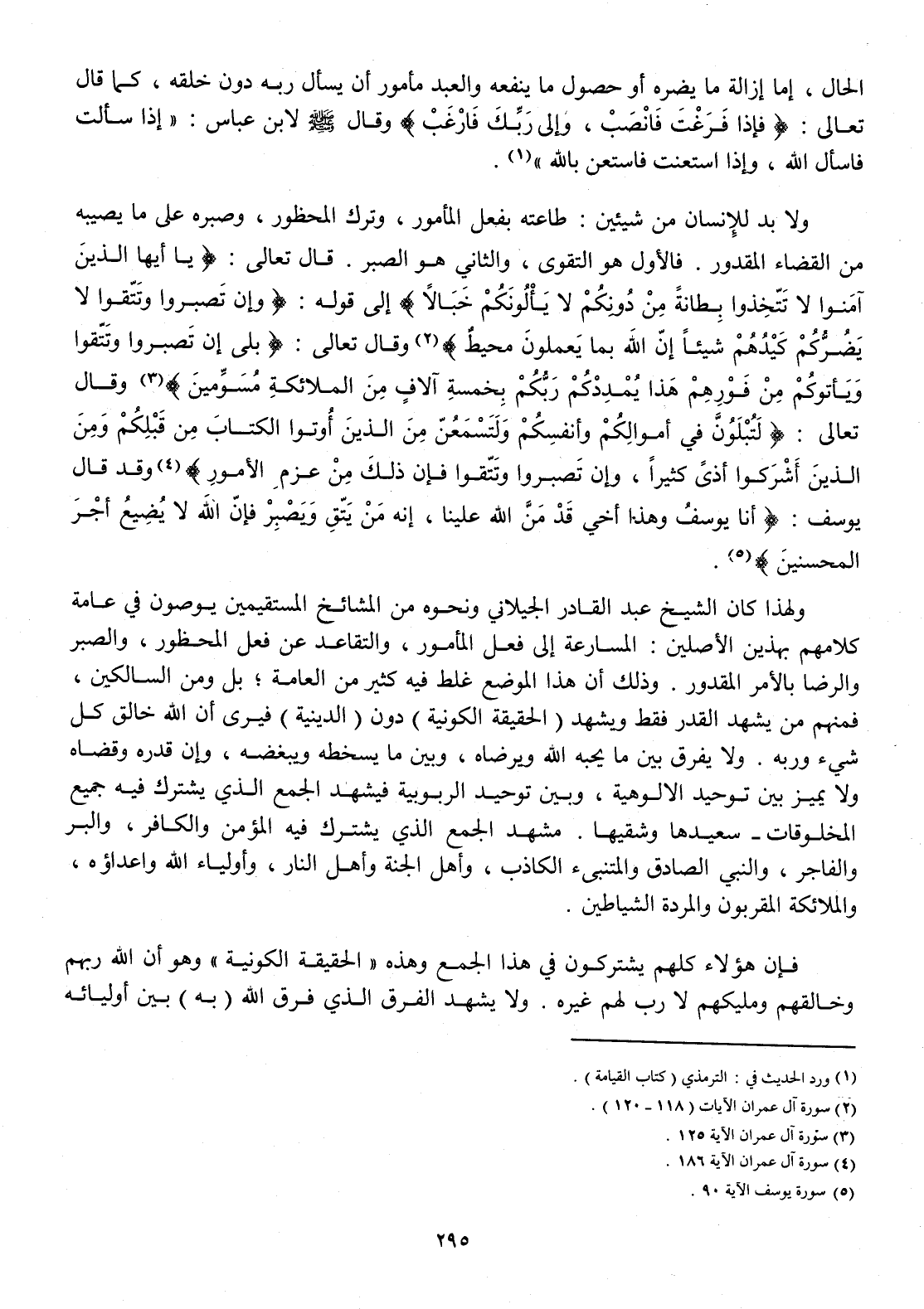 وَلِهَذَا كَانَ الشَّيْخ عبد الْقَادِر الجيلاني وَنَحْوه من المشائخ المستقيمين يوصون فِي عَامَّة كَلَامهم بِهَذَيْنِ الْأَصْلَيْنِ المسارعة إِلَى فعل الْمَأْمُور والتقاعد عَن فعل الْمَحْظُور وَالصَّبْر وَالرِّضَا بِالْأَمر الْمَقْدُور وَذَلِكَ أَن هَذَا الْموضع غلط فِيهِ كثير من الْعَامَّة بل وَمن السالكين فَمنهمْ من يشْهد الْقدر فَقَط وَيشْهد الْحَقِيقَة الكونية دون الدِّينِيَّة فَيرى أَن الله خَالق كل شَيْء وربه وَلَا يفرق بَين مَا يُحِبهُ الله ويرضاه وَبَين مَا يسخطه ويبغضه وَإِن قدره وقضاه وَلَا يُمَيّز بَين تَوْحِيد الألوهية وَبَين تَوْحِيد الربوبية فَيشْهد الْجمع الَّذِي يشْتَرك فِيهِ جَمِيع الْمَخْلُوقَات سعيدها وشقيها مشْهد الْجمع الَّذِي يشْتَرك فِيهِ الْمُؤمن وَالْكَافِر وَالْبر والفاجر وَالنَّبِيّ الصَّادِق والمتنبىء الْكَاذِب وَأهل الْجنَّة وَأهل النَّار وأولياء الله وأعداؤه وَالْمَلَائِكَة المقربون والمردة الشَّيَاطِين