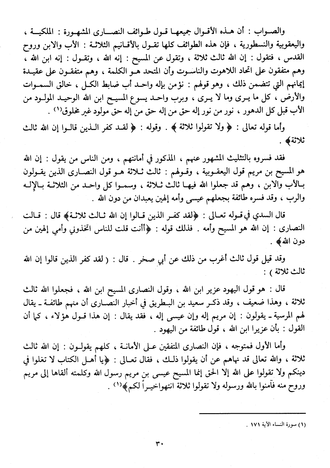 وَالصَّوَاب أَن هَذِه الْأَقْوَال جَمِيعهَا قَول طوائف النَّصَارَى الْمَشْهُورَة الملكية واليعقوبية والنسطورية فَإِن هَذِه الطوائف كلهَا تَقول بالأقانيم الثَّلَاثَة الْأَب وَالِابْن وروح الْقُدس فَتَقول إِن الله ثَالِث ثَلَاثَة وَتقول عَن الْمَسِيح إِنَّه الله وَتقول إِنَّه ابْن الله وهم متفقون على اتِّحَاد اللاهوت والناسوت وَأَن المتحد هُوَ الْكَلِمَة وهم متفقون على عقيدة إِيمَانهم الَّتِي تَتَضَمَّن ذَلِك وَهُوَ قَوْلهم نؤمن بإله وَاحِد أَب ضَابِط الْكل خَالق السَّمَاوَات وَالْأَرْض كل مَا يرى وَمَا لَا يرى وبرب وَاحِد يسوع الْمَسِيح ابْن الله الوحيد الْمَوْلُود من الْأَب قبل كل الدهور نور من نور إِلَه حق من إِلَه حق من إِلَه حق مَوْلُود غير مَخْلُوق