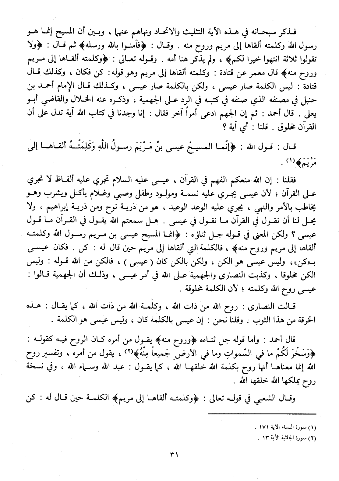 فَذكر سُبْحَانَهُ فِي هَذِه الْآيَة التَّثْلِيث والاتحاد ونهاهم عَنْهُمَا وَبَين أَن الْمَسِيح إِنَّمَا هُوَ رَسُول الله وكلمته أَلْقَاهَا إِلَى مَرْيَم وروح مِنْهُ وَقَالَ {فآمنوا بِاللَّه وَرُسُله} ثمَّ قَالَ {وَلَا تَقولُوا ثَلَاثَة انْتَهوا خيرا لكم} وَلم يذكر هُنَا أمه وَقَوله تَعَالَى {وكلمته أَلْقَاهَا إِلَى مَرْيَم وروح مِنْهُ} قَالَ معمر عَن قَتَادَة وكلمته أَلْقَاهَا إِلَى مَرْيَم وَهُوَ قَوْله كن فَكَانَ وَكَذَلِكَ قَالَ قَتَادَة لَيْسَ الْكَلِمَة صَار عِيسَى وَلَكِن بِالْكَلِمَةِ صَار عِيسَى وَكَذَلِكَ قَالَ الإِمَام أَحْمد بن حَنْبَل فِي مُصَنفه الَّذِي صنفه فِي كتبه فِي الرَّد على الْجَهْمِية وَذكره عَنهُ الْخلال وَالْقَاضِي أَبُو يعلى قَالَ أَحْمد ثمَّ إِن الجهم ادّعى أمرا آخر فَقَالَ إِنَّا وجدنَا فِي كتاب الله آيَة تدل على أَن الْقُرْآن مَخْلُوق قُلْنَا أَي آيَة