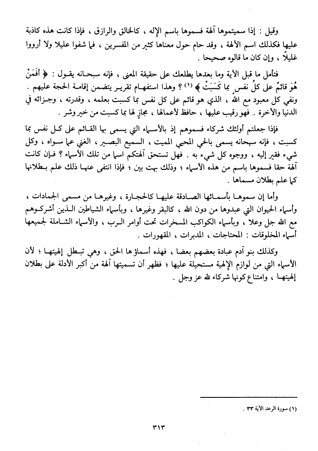 فَإِذا جعلتم أُولَئِكَ شُرَكَاء فسموهم إِذْ بالأسماء الَّتِي يُسمى بهَا الْقَائِم على كل نفس بِمَا كسبت فَإِنَّهُ سُبْحَانَهُ يُسمى بالحي المحيي المميت السَّمِيع الْبَصِير الْغَنِيّ عَمَّا سواهُ وكل شَيْء فَقير إِلَيْهِ ووجوه كل شَيْء بِهِ فَهَل تسْتَحقّ آلِهَتكُم اسْما من تِلْكَ الْأَسْمَاء فَإِن كَانَت آلِهَة حَقًا فسموها باسم من هَذِه الْأَسْمَاء وَذَلِكَ بهت بَين فَإِذا انْتَفَى عَنْهَا ذَلِك علم بُطْلَانهَا كَمَا علم بطلَان مسماها