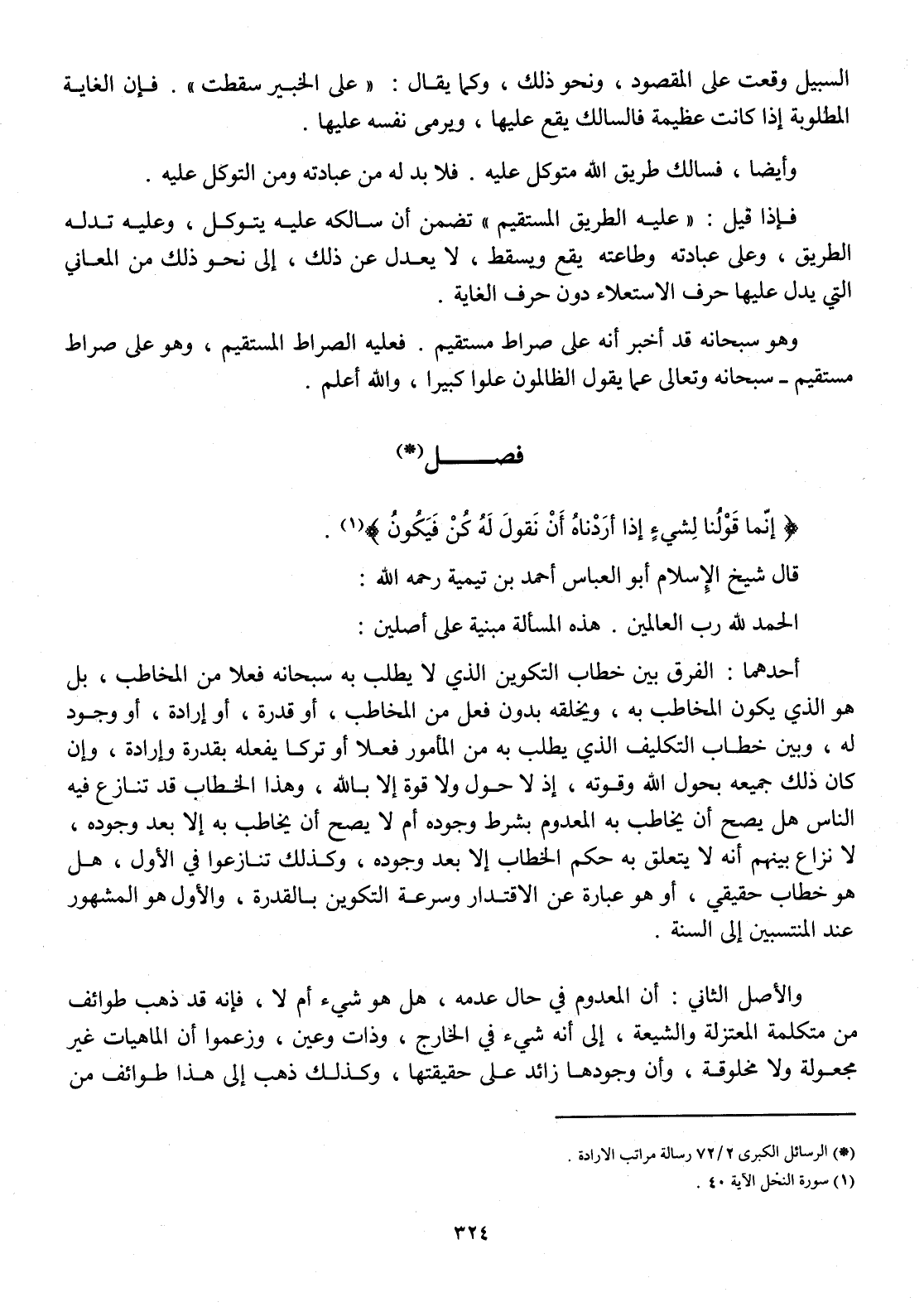 أَحدهمَا الْفرق بَين خطاب التكوين الَّذِي لَا يطْلب بِهِ سُبْحَانَهُ فعلا من الْمُخَاطب بل هُوَ الَّذِي يكون الْمُخَاطب بِهِ ويخلقه بِدُونِ فعل من الْمُخَاطب أَو قدرَة أَو إِرَادَة أَو وجود لَهُ وَبَين خطاب التَّكْلِيف الَّذِي يطْلب بِهِ من الْمَأْمُور فعلا أَو تركا يَفْعَله بقدرة وَإِرَادَة وَإِن كَانَ ذَلِك جَمِيعه بجول الله وقوته إِذْ لَا حول وَلَا قُوَّة إِلَّا بِاللَّه وَهَذَا الْخطاب قد تنَازع فِيهِ النَّاس هَل يَصح أَن يُخَاطب بِهِ الْمَعْدُوم بِشَرْط وجوده أم لَا يَصح أَن يُخَاطب بِهِ إِلَّا بعد وجوده لَا نزاع بَينهم أَنه لَا يتَعَلَّق بِهِ حكم الْخطاب إِلَّا بعد وجوده وَكَذَلِكَ تنازعوا فِي الأول هَل هُوَ خطاب حَقِيقِيّ أَو هُوَ عبارَة عَن الاقتدار وَسُرْعَة التكوين بِالْقُدْرَةِ وَالْأول هُوَ الْمَشْهُور عِنْد المنتسبين إِلَى السّنة