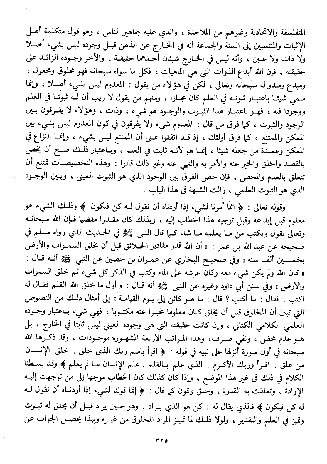 وَقَوله تَعَالَى {إِنَّمَا قَوْلنَا لشَيْء إِذا أردناه أَن نقُول لَهُ كن فَيكون} وَذَلِكَ الشَّيْء هُوَ مَعْلُوم قبل إبداعه وَقبل تَوْجِيه هَذَا الْخطاب إِلَيْهِ وَبِذَلِك كَانَ مُقَدرا مقضيا فَإِن سُبْحَانَ وَتَعَالَى يَقُول وَيكْتب من مَا يُعلمهُ مَا شَاءَ كَمَا قَالَ النَّبِي صلى الله عَلَيْهِ وَسلم فِي الحَدِيث الَّذِي رَوَاهُ مُسلم فِي صَحِيحه عَن عبد الله بن عمر أَن الله قدر مقادير الْخَلَائق قبل أَن يخلق السَّمَوَات وَالْأَرْض بِخَمْسِينَ ألف سنة وَفِي صَحِيح البُخَارِيّ عَن عمرَان بن حُصَيْن عَن النَّبِي صلى الله عَلَيْهِ وَسلم أَنه قَالَ كَانَ الله وَلم يكن شَيْء مَعَه وَكَانَ عَرْشه على المَاء وَكتب فِي الذّكر كل شَيْء ثمَّ خلق السَّمَوَات وَالْأَرْض وَفِي سنَن أبي دَاوُد وَغَيره عَن النَّبِي صلى الله عَلَيْهِ وَسلم أَنه قَالَ أول مَا خلق الله الْقَلَم فَقَالَ لَهُ اكْتُبْ فَقَالَ مَا أكتب قَالَ مَا هُوَ كَائِن إِلَى يَوْم الْقِيَامَة إِلَى أَمْثَال ذَلِك من النُّصُوص الَّتِي تبين أَن الْمَخْلُوق قبل أَن يخلق كَانَ مَعْلُوما مخبرا عَنهُ مَكْتُوبًا فِيهِ شَيْء بِاعْتِبَار وجوده العلمي الكلامي الْكِتَابِيّ وَإِن كَانَت حَقِيقَته الَّتِي هِيَ وجوده الْعَيْنِيّ لَيْسَ ثَابتا فِي الْخَارِج بل هُوَ عدم مَحْض وَنفي صرف وَهَذِه الْمَرَاتِب الْأَرْبَعَة الْمَشْهُورَة موجودات وَقد ذكرهَا الله سُبْحَانَهُ فِي أول سُورَة أنزلهَا على نبيه فِي قَوْله {اقْرَأ باسم رَبك الَّذِي خلق خلق الْإِنْسَان من علق اقْرَأ وَرَبك الأكرم الَّذِي علم بالقلم علم الْإِنْسَان مَا لم يعلم} وَقد بسطنا الْكَلَام فِي ذَلِك فِي غير هَذَا الْموضع وَإِذا كَانَ كَذَلِك كَانَ الْخطاب موجها إِلَى من تَوَجَّهت إِلَيْهِ الْإِرَادَة وتعلقت بِهِ الْقُدْرَة وَخلق وَكَون كَمَا قَالَ {إِنَّمَا قَوْلنَا لشَيْء إِذا أردناه أَن نقُول لَهُ كن فَيكون} فَالَّذِي يُقَال لَهُ كن هُوَ الَّذِي يُرَاد وَهُوَ حِين يُرَاد قبل أَن يخلق لَهُ ثُبُوت وتميز فِي الْعلم وَالتَّقْدِير وَلَوْلَا ذَلِك لما تميز المُرَاد الْمَخْلُوق من غَيره وَبِهَذَا يحصل الْجَواب عَن