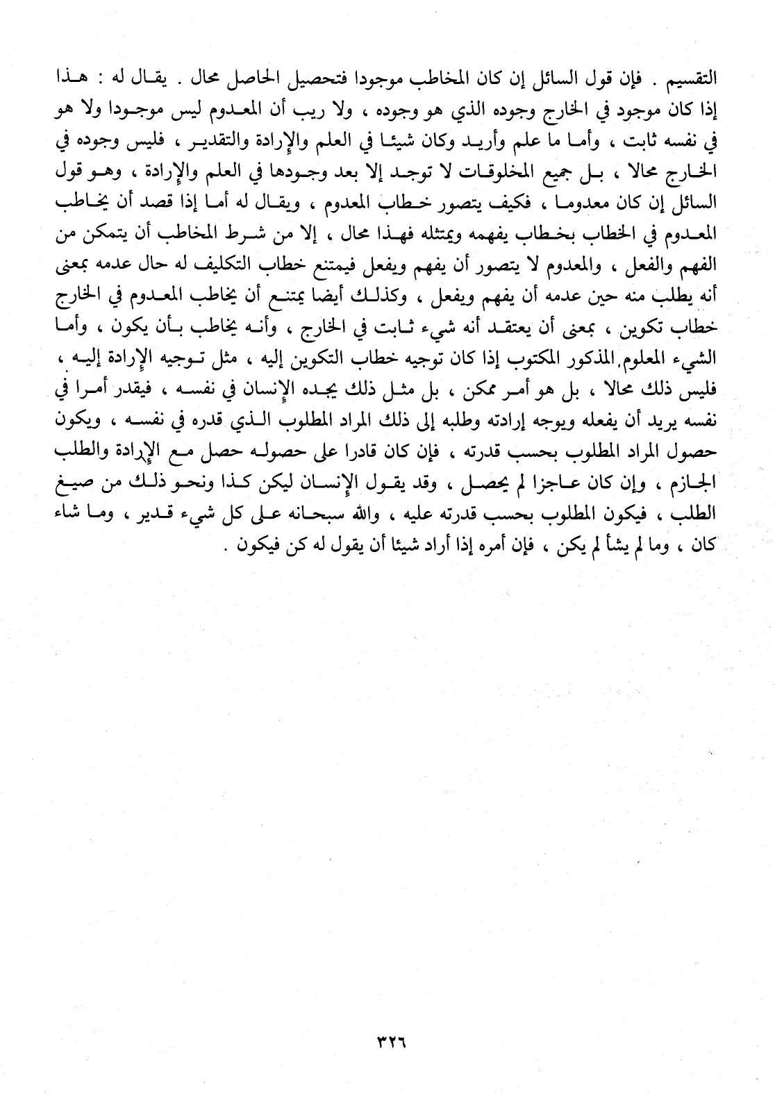 التَّقْسِيم فَإِن قَول السَّائِل إِن كَانَ الْمُخَاطب مَوْجُودا فتحصيل الْحَاصِل محَال يُقَال لَهُ هَذَا إِذا كَانَ مَوْجُود فِي الْخَارِج وجوده الَّذِي هُوَ وجوده وَلَا ريب أَن الْمَعْدُوم لَيْسَ مَوْجُودا وَلَا هُوَ فِي نَفسه ثَابت وَأما مَا علم وَأُرِيد وَكَانَ شَيْئا فِي الْعلم والإرادة وَالتَّقْدِير فَلَيْسَ وجوده فِي الْخَارِج محالا بل جَمِيع الْمَخْلُوقَات لَا تُوجد إِلَّا بعد وجودهَا فِي الْعلم والإرادة وَهُوَ قَول السَّائِل إِن كَانَ مَعْدُوما فَكيف يتَصَوَّر خطاب الْمَعْدُوم وَيُقَال لَهُ أما إِذا قصد أَن يُخَاطب الْمَعْدُوم فِي الْخطاب بخطاب يفهمهُ ويمتثله فَهَذَا محَال إِلَّا من شَرط الْمُخَاطب أَن يتَمَكَّن من الْفَهم وَالْفِعْل والمعدوم لَا يتَصَوَّر أَن يفهم وَيفْعل فَيمْتَنع خطاب التَّكْلِيف لَهُ حَال عَدمه بِمَعْنى أَنه يطْلب مِنْهُ حِين عَدمه أَن يفهم وَيفْعل وَكَذَلِكَ أَيْضا يمْتَنع أَن يُخَاطب الْمَعْدُوم فِي الْخَارِج خطاب تكوين بِمَعْنى أَن يعْتَقد أَنه شَيْء ثَابت فِي الْخَارِج وَأَنه يُخَاطب بِأَن يكون وَأما الشَّيْء الْمَعْلُوم الْمَذْكُور الْمَكْتُوب إِذا كَانَ تَوْجِيه خطاب التكوين إِلَيْهِ مثل تَوْجِيه الْإِرَادَة إِلَيْهِ فَلَيْسَ ذَلِك محالا بل هُوَ أَمر مُمكن بل مثل ذَلِك يجده الْإِنْسَان فِي نَفسه فيقد أَمر افي نَفسه يُرِيد أَن يَفْعَله وَيُوجه إِرَادَته وَطَلَبه إِلَى ذَلِك المُرَاد الْمَطْلُوب الَّذِي قدره فِي نَفسه وَيكون حُصُول المُرَاد الْمَطْلُوب بِحَسب قدرته فَإِن كَانَ قَادِرًا على حُصُوله حصل مَعَ الْإِرَادَة والطلب الْجَازِم وَإِن كَانَ عَاجِزا لم يحصل وَقد يَقُول الْإِنْسَان ليكن كَذَا وَنَحْو ذَلِك من صِيغ الطّلب فَيكون الْمَطْلُوب بِحَسب قدرته عَلَيْهِ وَالله سُبْحَانَهُ على كل شَيْء قدير وَمَا شَاءَ كَانَ وَمَا لم يَشَأْ لم يكن فَإِن أمره إِذا أَرَادَ شَيْئا أَن يَقُول لَهُ كن فَيكون