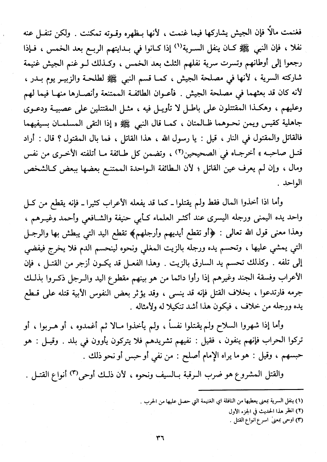 فَغنِمت مَالا فَإِن الْجَيْش يشاركها فِيمَا غنمت لِأَنَّهَا بظهره وقوته تمكنت وَلَكِن تنفل عَنهُ نفلا فَإِن النَّبِي صلى الله عَلَيْهِ وَسلم كَانَ ينفل السّريَّة إِذا كَانُوا فِي بدايتهم الرّبع بعد الْخمس فَإِذا رجعُوا إِلَى أوطانهم وتسرت سَرِيَّة نفلهم الثُّلُث بعد الْخمس وَكَذَلِكَ لَو غنم الْجَيْش غنيمَة شاركته السّريَّة لِأَنَّهَا فِي مصلحَة الْجَيْش كَمَا قسم النَّبِي صلى الله عَلَيْهِ وَسلم لطلْحَة وَالزُّبَيْر يَوْم بدر لِأَنَّهُ كَانَ قد بعثهما فِي مصلحَة الْجَيْش فأعوان الطَّائِفَة الممتنعة وأنصارها مِنْهَا فِيمَا لَهُم وَعَلَيْهِم وَهَكَذَا المقتتلون على بَاطِل لَا تَأْوِيل فِيهِ مثل المقتتلين على عصبية وَدَعوى جَاهِلِيَّة كقيس ويمن نَحْوهمَا ظالمتان كَمَا قَالَ النَّبِي صلى الله عَلَيْهِ وَسلم