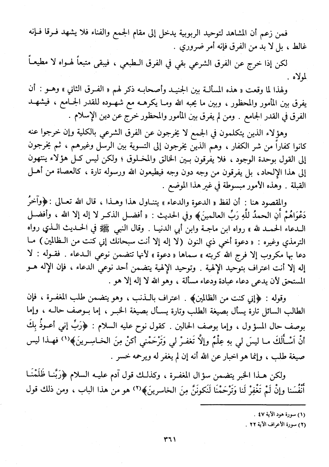 وَالْمَقْصُود هُنَا أَن لفظ الدعْوَة وَالدُّعَاء يتَنَاوَل هَذَا وَهَذَا قَالَ الله تَعَالَى {وَآخر دَعوَاهُم أَن الْحَمد لله رب الْعَالمين} وَفِي الحَدِيث أفضل الذّكر لَا إِلَه إِلَّا الله وَأفضل الدُّعَاء الْحَمد لله رَوَاهُ ابْن ماجة وَابْن أبي الدُّنْيَا وَقَالَ النَّبِي صلى الله عَلَيْهِ وَسلم فِي الحَدِيث الَّذِي رَوَاهُ التِّرْمِذِيّ وَغَيره دَعْوَة أخي ذِي النُّون لَا إِلَه إِلَّا أَنْت سُبْحَانَكَ إِنِّي كنت من الظَّالِمين مَا دَعَا بهَا مكروب إِلَّا فرج الله كربته سَمَّاهَا دَعْوَة لِأَنَّهَا تَتَضَمَّن نَوْعي الدُّعَاء فَقَوله لَا إِلَه إِلَّا أَنْت اعْتِرَاف بتوحيد الإلهية وتوحيد الإلهية يتَضَمَّن اُحْدُ نَوْعي الدُّعَاء فَإِن الْإِلَه هُوَ الْمُسْتَحق لِأَن يدعى دُعَاء عباده وَدُعَاء مَسْأَلَة وَهُوَ الله لَا إِلَه إِلَّا هُوَ