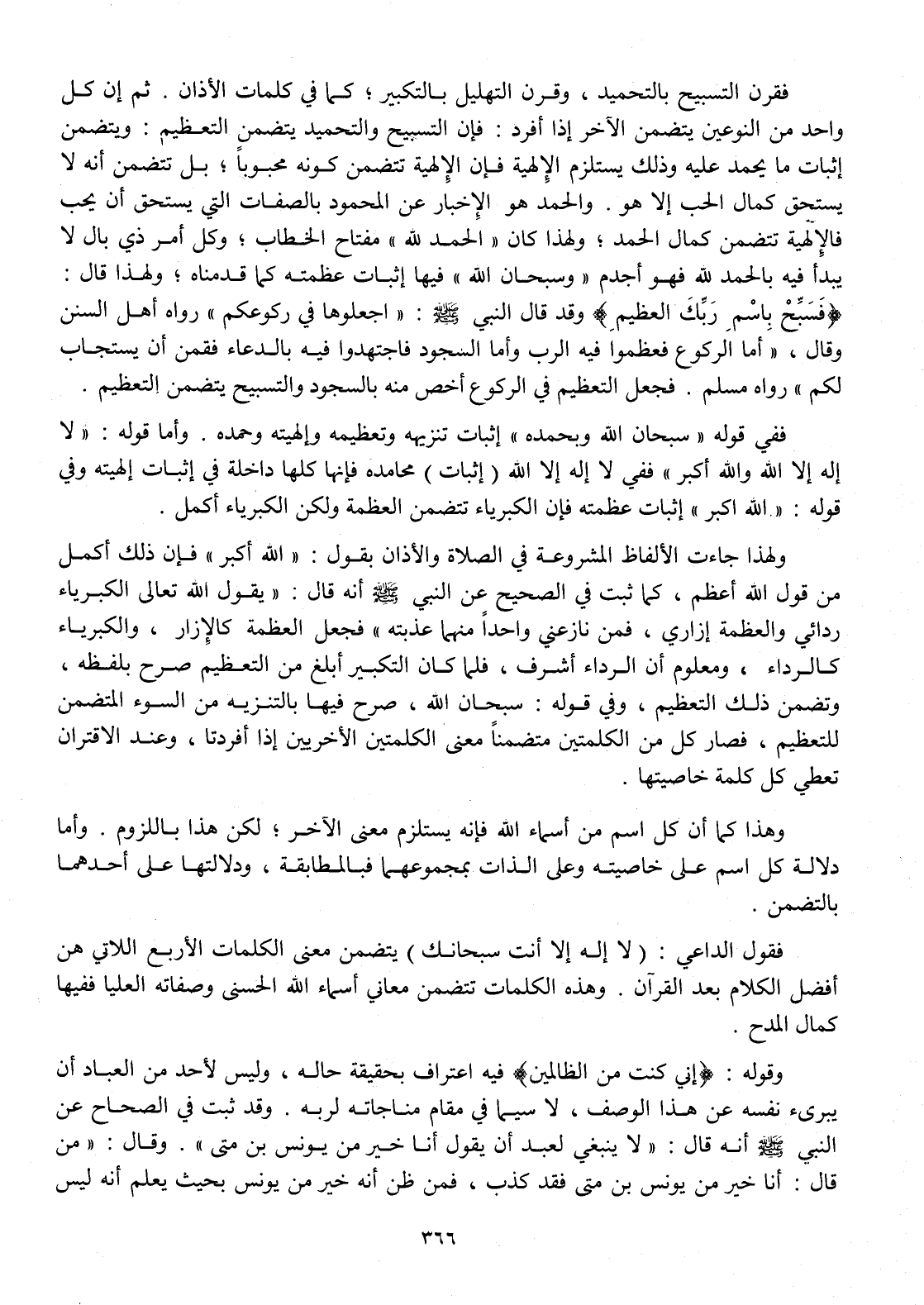 فقرن التَّسْبِيح بالتحميد وَقرن التهليل بِالتَّكْبِيرِ كَمَا فِي كَلِمَات الْأَذَان ثمَّ إِن كل وَاحِد من النَّوْعَيْنِ يتَضَمَّن الآخر إِذا أفرد فَإِن التَّسْبِيح والتحميد يتَضَمَّن التَّعْظِيم ويتضمن إِثْبَات مَا يحمد عَلَيْهِ وَذَلِكَ يسْتَلْزم الإلهية فَإِن الإلهية تَتَضَمَّن كَونه محبوبا بل تَتَضَمَّن أَنه لَا يسْتَحق كَمَال الْحبّ إِلَّا هُوَ وَالْحَمْد هُوَ الْإِخْبَار عَن الْمَحْمُود بِالصِّفَاتِ الَّتِي يسْتَحق أَن يجب فالإلهية تَتَضَمَّن كَمَال الْحَمد وَلِهَذَا كَانَ الْحَمد لله مِفْتَاح الْخطاب وكل أَمر ذِي بَال لَا يبْدَأ فِيهِ بِالْحَمْد لله فَهُوَ أجدم وَسُبْحَان الله فِيهَا إِثْبَات عَظمته كَمَا قدمْنَاهُ وَلِهَذَا قَالَ {فسبح باسم رَبك الْعَظِيم} وَقد قَالَ النَّبِي صلى الله عَلَيْهِ وَسلم اجْعَلُوهَا فِي ركوعكم رَوَاهُ أهل السّنَن وَقَالَ اما الرُّكُوع فَعَظمُوا فِيهِ الرب وَأما السُّجُود فاجتهدوا فِيهِ بِالدُّعَاءِ فقمن أَن يُسْتَجَاب لكم رَوَاهُ مُسلم فَجعل التَّعْظِيم فِي الرُّكُوع أخص مِنْهُ بِالسُّجُود وَالتَّسْبِيح يتَضَمَّن التَّعْظِيم