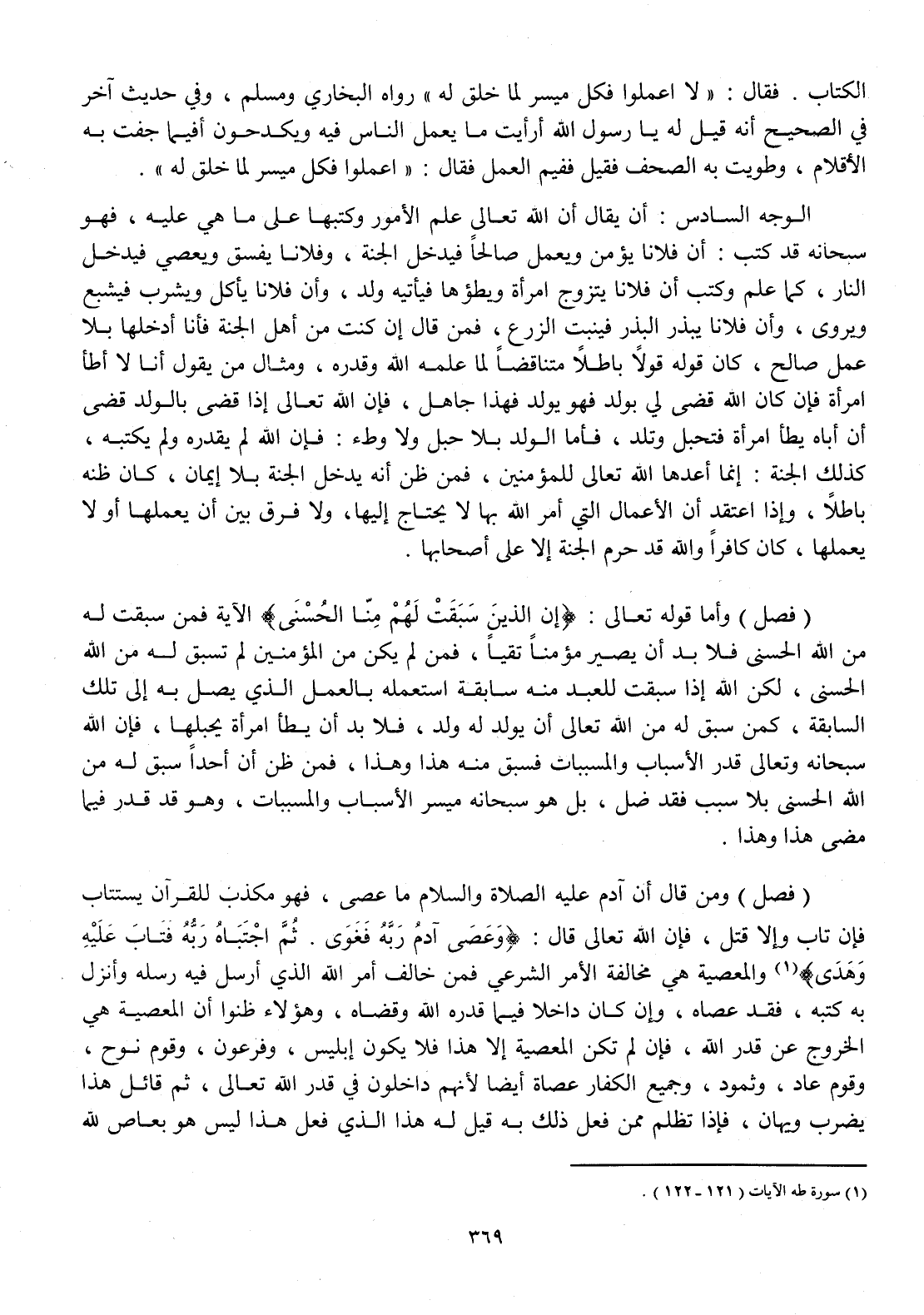 الْكتاب فَقَالَ لَا اعْمَلُوا فَكل ميسر لما خلق لَهُ رَوَاهُ البُخَارِيّ وَمُسلم وَفِي حَدِيث آخر فِي الصَّحِيح أَنه قيل لَهُ يَا رَسُول الله أَرَأَيْت مَا يعْمل النَّاس فِيهِ ويكدحون أفيما جَفتْ بِهِ الأقلام وطويت بِهِ الصُّحُف فَقيل فَفِيمَ الْعَمَل فَقَالَ اعْمَلُوا فَكل ميسر لما خلق لَهُ