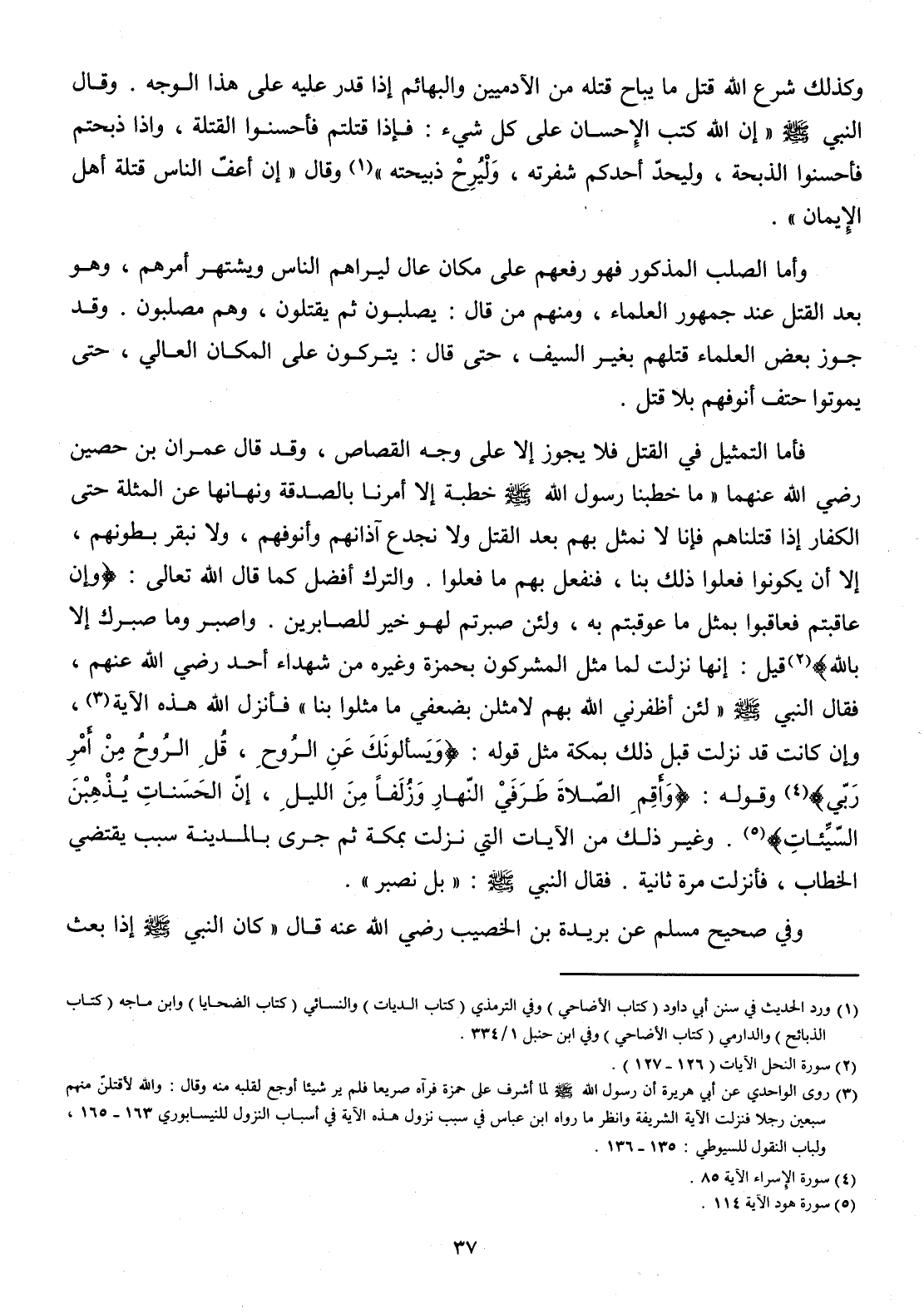 فَأَما التَّمْثِيل فِي الْقَتْل فَلَا يجوز إِلَّا على وَجه الْقصاص وَقد قَالَ عمرَان بن حُصَيْن رَضِي الله عَنْهُمَا مَا خَطَبنَا رَسُول الله صلى الله عَلَيْهِ وَسلم خطْبَة إِلَّا أمرنَا بِالصَّدَقَةِ ونهانها عَن الْمثلَة حَتَّى الْكفَّار إِذا قتلناهم فَإنَّا لَا نمثل بهم بعد الْقَتْل وَلَا نجدع آذانهم وأنوفهم وَلَا نبقر بطونهم إِلَّا أَن يَكُونُوا فعلوا ذَلِك بِنَا فنفعل بهم مَا فعلوا وَالتّرْك أفضل كَمَا قَالَ الله تَعَالَى {وَإِن عَاقَبْتُمْ فَعَاقِبُوا بِمثل مَا عُوقِبْتُمْ بِهِ وَلَئِن صَبَرْتُمْ لَهو خير للصابرين واصبر وَمَا صبرك إِلَّا بِاللَّه} قيل إِنَّهَا نزلت لما مثل الْمُشْركُونَ بِحَمْزَة وَغَيره من شُهَدَاء أحد رَضِي الله عَنْهُم فَقَالَ النَّبِي صلى الله عَلَيْهِ وَسلم