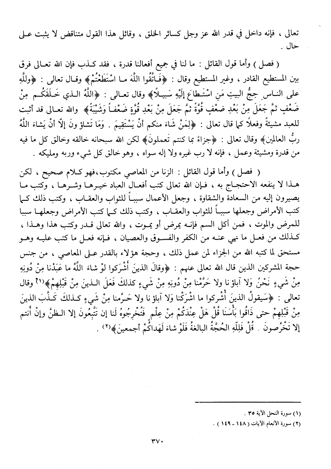 فصل وَأما قَول الْقَائِل الزِّنَا من الْمعاصِي مَكْتُوب فَهُوَ كَلَام صَحِيح لَكِن هَذَا لَا يَنْفَعهُ الِاحْتِجَاج بِهِ فَإِن الله تَعَالَى كتب أَفعَال الْعباد خَيرهَا وشرها وَكتب مَا يصيرون إِلَيْهِ من السَّعَادَة والشقاوة وَجعل الْأَعْمَال سَببا للثَّواب وَالْعِقَاب وَكتب ذَلِك كَمَا كتب الْأَمْرَاض وَجعلهَا سَببا للثَّواب وَالْعِقَاب وَكتب ذَلِك كَمَا كتب الْأَمْرَاض وَجعلهَا سَببا للمرض وَالْمَوْت فَمن أكل السم فَإِنَّهُ يمرض أَو يَمُوت وَالله تَعَالَى قدر وَكتب هَذَا وَهَذَا كَذَلِك من فعل مَا نهي عَنهُ من الْكفْر والفسوق والعصيان فَإِنَّهُ فعل مَا كتب عَلَيْهِ وَهُوَ مُسْتَحقّ لما كتبه الله من الْجَزَاء لمن عمل ذَلِك وَحجَّة هَؤُلَاءِ بِالْقدرِ على الْمعاصِي من جنس حجَّة الْمُشْركين الَّذين قَالَ الله تَعَالَى عَنْهُم {وَقَالَ الَّذين أشركوا لَو شَاءَ الله مَا عَبدنَا من دونه من شَيْء نَحن وَلَا آبَاؤُنَا وَلَا حرمنا من دونه من شَيْء كَذَلِك فعل الَّذين من قبلهم} وَقَالَ تَعَالَى {سَيَقُولُ الَّذين أشركوا لَو شَاءَ الله مَا أشركنا وَلَا آبَاؤُنَا وَلَا حرمنا من شَيْء كَذَلِك كذب الَّذين من قبلهم حَتَّى ذاقوا بأسنا قل هَل عنْدكُمْ من علم فتخرجوه لنا إِن تتبعون إِلَّا الظَّن وَإِن أَنْتُم إِلَّا تخرصون قل فَللَّه الْحجَّة الْبَالِغَة فَلَو شَاءَ لهداكم أَجْمَعِينَ}