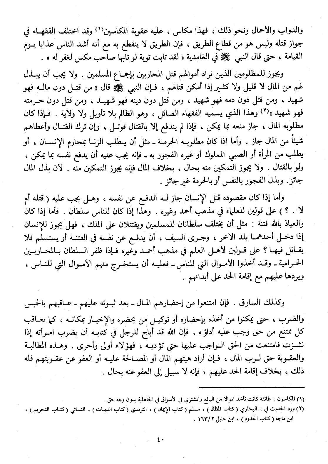 وَالدَّوَاب والأحمال وَنَحْو ذَلِك فَهَذَا مكاس عَلَيْهِ عُقُوبَة المكاسين وَقد اخْتلف الْفُقَهَاء جَوَاز قَتله وَلَيْسَ هُوَ من قطاع الطَّرِيق فَإِن الطَّرِيق لَا يَنْقَطِع بِهِ مَعَ أَنه أَشد النَّاس عذَابا يَوْم الْقِيَامَة حَتَّى قَالَ النَّبِي صلى الله عَلَيْهِ وَسلم فِي الغامدية