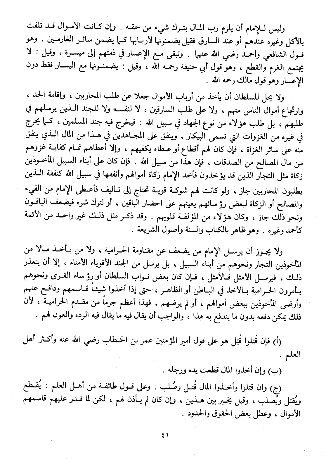 وَلَا يحل للسُّلْطَان أَن يَأْخُذ من أَرْبَاب الْأَمْوَال جعلا عَن طلب الْمُحَاربين وَإِقَامَة الْحَد وارتجاع أَمْوَال النَّاس مِنْهُم وَلَا على طلب السارقين لَا لنَفسِهِ وَلَا للجند الَّذين يرسلهم فِي طَلَبهمْ بل طلب هَؤُلَاءِ من نوع الْجِهَاد فِي سَبِيل الله فَيخرج فِيهِ جند الْمُسلمين كَمَا يخرج فِي غَيره من الْغَزَوَات الَّتِي تسمي البيكار وَينْفق على الْمُجَاهدين فِي هَذَا من المَال الَّذِي ينْفق مِنْهُ على سَائِر الْغُزَاة فَإِن كَانَ لَهُ أقطاع أَو عَطاء يكفيهم وَإِلَّا أَعْطَاهُم تَمام كِفَايَة غزوهم من مَال الْمصَالح من الصَّدقَات فَإِن هَذَا من سَبِيل الله فَإِن كَانَ على أَبنَاء السَّبِيل المأخوذين زَكَاة مثل التُّجَّار الَّذين قد يؤخذون فَأخذ الإِمَام زَكَاة أَمْوَالهم وأنفقها فِي سَبِيل الله كَنَفَقَة الَّذين يطْلبُونَ الْمُحَاربين جَازَ وَلَو كَانَت لَهُم شَوْكَة قَوِيَّة تحْتَاج إِلَى تأليف فَأعْطى الإِمَام من الْفَيْء والمصالح أَو الزَّكَاة لِبُغْض رُؤَسَائِهِمْ يعينهم على إِحْضَار البَاقِينَ أَو لترك شَره فيضعف الْبَاقُونَ وَنَحْو ذَلِك جَازَ وَكَانَ هَؤُلَاءِ من الْمُؤَلّفَة قُلُوبهم وَقد ذكر مثل ذَلِك غير وَاحِد من الْأَئِمَّة كأحمد وَغَيره وَهُوَ ظَاهر بِالْكتاب وَالسّنة وأصول الشَّرِيعَة