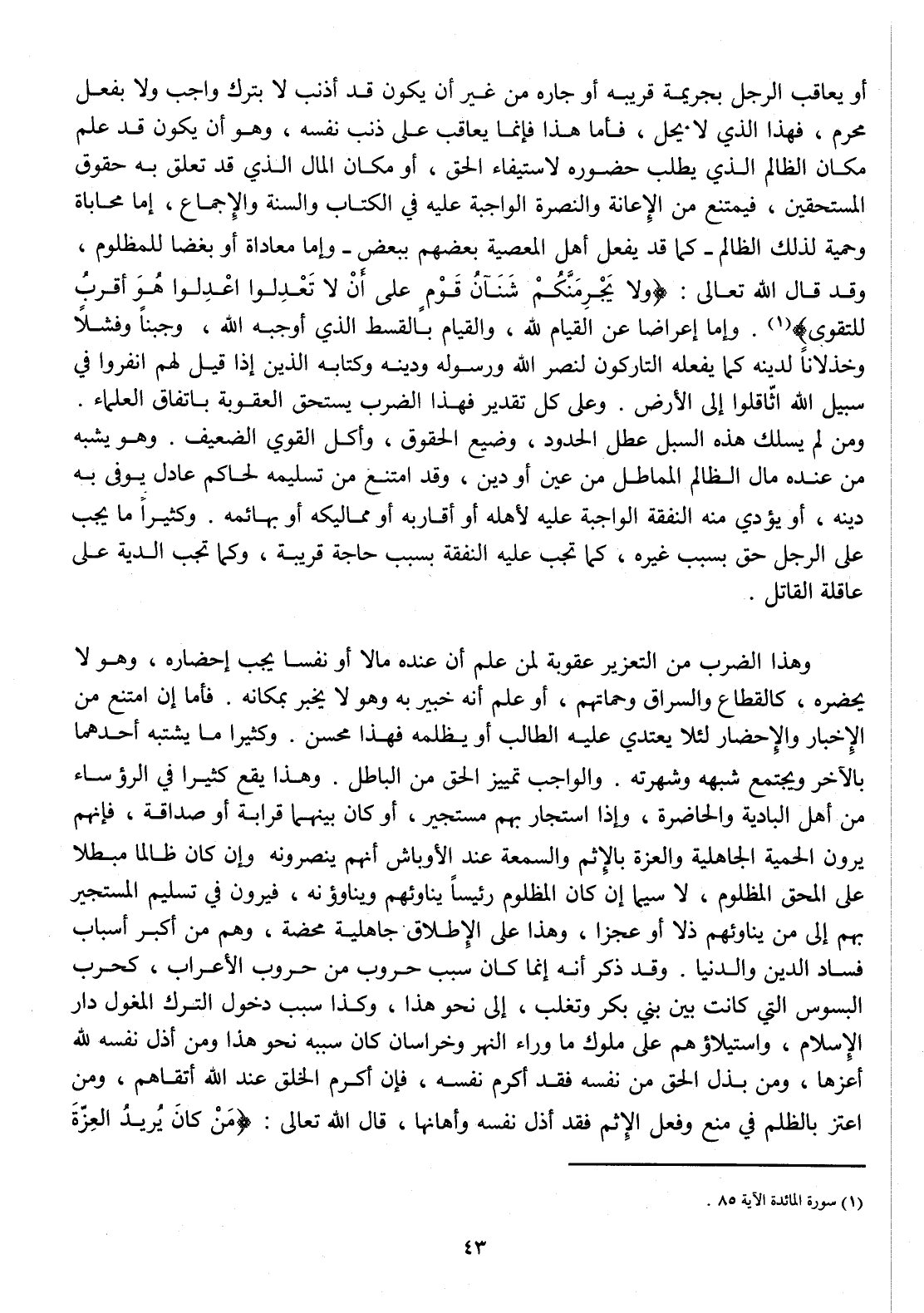 أَو يُعَاقب الرجل بجريمة قَرِيبه أَو جَاره من غير أَن يكون قد أذْنب لَا بترك وَاجِب وَلَا بِفعل محرم فَهَذَا الَّذِي لَا يحل فَأَما هَذَا فَإِنَّمَا يُعَاقب على ذَنْب نَفسه وَهُوَ أَن يكون قد علم مَكَان الظَّالِم الَّذِي يطْلب حُضُوره لِاسْتِيفَاء الْحق أَو مَكَان المَال الَّذِي قد تعلق بِهِ حُقُوق الْمُسْتَحقّين فَيمْتَنع من الْإِعَانَة والنصرة الْوَاجِبَة عَلَيْهِ فِي الْكتاب وَالسّنة وَالْإِجْمَاع إِمَّا مُحَابَاة وحمية لذَلِك الظَّالِم كَمَا قد يفعل أهل الْمعْصِيَة بَعضهم بِبَعْض وَإِمَّا معاداة أَو بغضا للمظلوم وَقد قَالَ الله تَعَالَى {وَلَا يجرمنكم شنآن قوم على أَلا تعدلوا اعدلوا هُوَ أقرب للتقوى} وَإِمَّا إعْرَاضًا عَن الْقيام لله وَالْقِيَام بِالْقِسْطِ الَّذِي أوجبه الله وجبنا وفشلا وخذلانا لدينِهِ كَمَا يَفْعَله التاركون لنصر الله وَرَسُوله وَدينه وَكتابه الَّذين إِذا قيل لَهُم انفروا فِي سَبِيل الله اثاقلوا إِلَى الأَرْض وعَلى كل تَقْدِير فَهَذَا الضَّرْب يسْتَحق الْعقُوبَة بِاتِّفَاق الْعلمَاء وَمن لم يسْلك هَذِه السبل عطل الْحُدُود وضيع الْحُقُوق وَأكل الْقوي الضَّعِيف وَهُوَ يشبه من عِنْده مَال الظَّالِم المماطل من عين أَو دين وَقد امْتنع من تَسْلِيمه لحَاكم عَادل يُوفى بِهِ دينه أَو يُؤَدِّي مِنْهُ النَّفَقَة الْوَاجِبَة عَلَيْهِ لأَهله أَو أَقَاربه أَو مماليكه أَو بهائمه وَكَثِيرًا مَا يجب على الرجل حق بِسَبَب غَيره كَمَا تجب عَلَيْهِ النَّفَقَة بِسَبَب حَاجَة قريبَة وكما تجب الدِّيَة على عَاقِلَة الْقَاتِل
