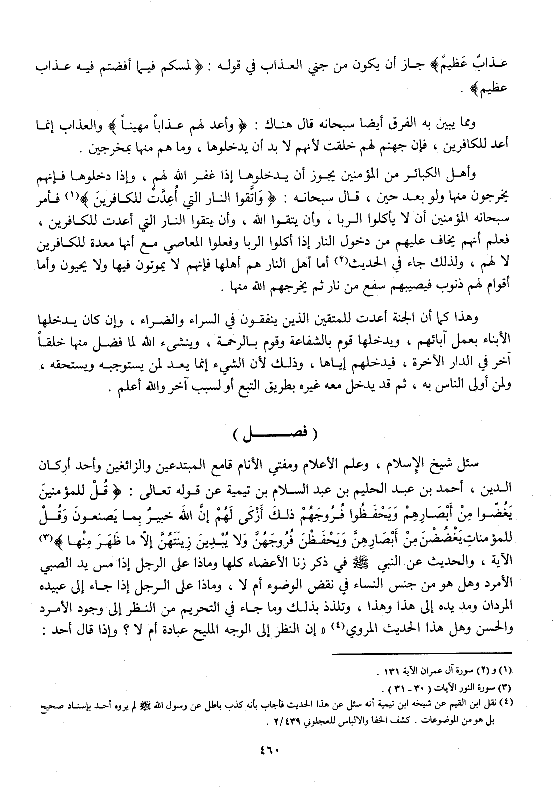 وَأهل الْكَبَائِر من الْمُؤمنِينَ يجوز أَن يدخلوها إِذا غفر الله لَهُم وَإِذا دخلوها فَإِنَّهُم يخرجُون مِنْهَا وَلَو بعد حِين قَالَ سُبْحَانَهُ {وَاتَّقوا النَّار الَّتِي أعدت للْكَافِرِينَ} فَأمر سُبْحَانَهُ الْمُؤمنِينَ أَن لَا يَأْكُلُوا الرِّبَا وَأَن يتقوا الله وَأَن يتقوا النَّار الَّتِي أعدت للْكَافِرِينَ فَعلم أَنهم يخَاف عَلَيْهِم من دُخُول النَّار إِذا أكلُوا الرِّبَا وفعلوا الْمعاصِي مَعَ أَنَّهَا معدة للْكَافِرِينَ لَا لَهُم وَلذَلِك جَاءَ فِي الحَدِيث أما أهل النَّار هم أَهلهَا فَإِنَّهُم لَا يموتون فِيهَا وَلَا يحيون وَأما أَقوام لَهُم ذنُوب فيصيبهم سفع من نَار ثمَّ يخرجهم الله مِنْهَا