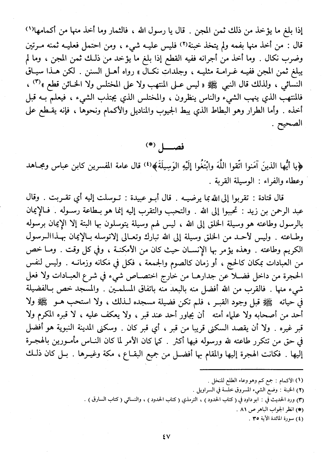 قَالَ قَتَادَة تقربُوا إِلَى الله بِمَا يرضيه قَالَ أَبُو عُبَيْدَة توسلت إِلَيْهِ أَي تقربت وَقَالَ عبد الرَّحْمَن بن زيد تحببوا إِلَى الله والتحبب والتقرب إِلَيْهِ إِنَّمَا هُوَ بِطَاعَة رَسُوله فالإيمان بالرسول وطاعته هُوَ وَسِيلَة الْخلق إِلَى الله لَيْسَ لَهُم وَسِيلَة يتوسلون بهَا الْبَتَّةَ إِلَّا الْإِيمَان بِرَسُولِهِ وطاعته وَلَيْسَ لأحد من الْخلق وَسِيلَة إِلَى الله تبَارك وَتَعَالَى إِلَّا توسله بِالْإِيمَان بِهَذَا الرَّسُول الْكَرِيم وطاعته وَهَذِه يُؤمر بهَا الْإِنْسَان حَيْثُ كَانَ من الْأَمْكِنَة وَفِي كل وَقت وَمَا خص من الْعِبَادَات بمَكَان كَالْحَجِّ أَو زمَان كَالصَّوْمِ وَالْجُمُعَة فَكل فِي مَكَانَهُ وزمانه وَلَيْسَ لنَفس الْحُجْرَة من دَاخل فضلا عَن جدارها من خَارج اخْتِصَاص شَيْء فِي شرع الْعِبَادَات وَلَا فعل شَيْء مِنْهَا فالقرب من الله أفضل مِنْهُ بالبعد مِنْهُ بِاتِّفَاق الْمُسلمين وَالْمَسْجِد خص بالفضيلة فِي حَيَاته صلى الله عَلَيْهِ وَسلم قبل وجود الْقَبْر فَلم تكن فَضِيلَة مَسْجده لذَلِك وَلَا اسْتحبَّ هُوَ صلى الله عَلَيْهِ وَسلم وَلَا أحد من أَصْحَابه وَلَا عُلَمَاء أمته أَن يجاور أحد عِنْد قبر ولايعكف عَلَيْهِ لَا قَبره المكرم وَلَا قبر غَيره وَلَا أَن يقْصد السُّكْنَى قَرِيبا من قبر أَي قبر كَانَ وسكنى الْمَدِينَة النَّبَوِيَّة هُوَ أفضل فِي حق من تَتَكَرَّر طَاعَته لله وَرَسُوله فِيهَا أَكثر كَمَا كَانَ الْأَمر لما كَانَ النَّاس مأمورين بِالْهِجْرَةِ إِلَيْهَا فَكَانَت الْهِجْرَة إِلَيْهَا وَالْمقَام بهَا أفضل من جَمِيع الْبِقَاع مَكَّة وَغَيرهَا بل كَانَ ذَلِك