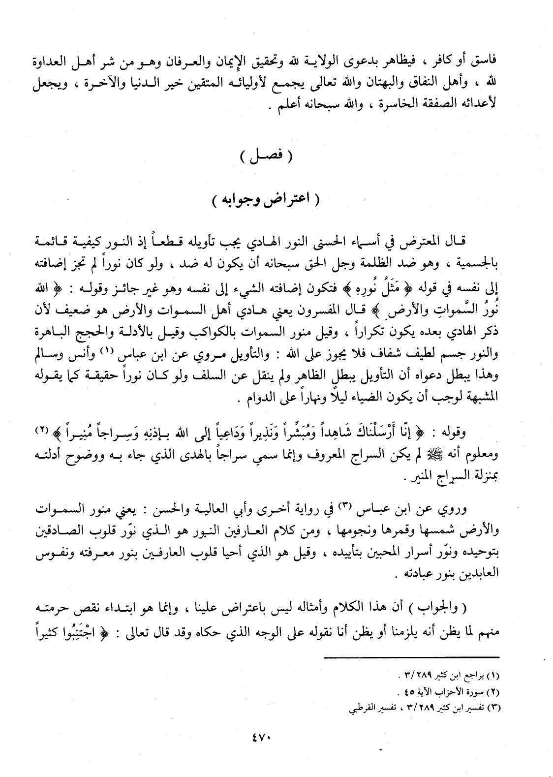 قَالَ الْمُعْتَرض فِي أَسمَاء الله الْحسنى النُّور الْهَادِي يجب تَأْوِيله قطعا إِذْ النُّور كَيْفيَّة قَائِمَة بالجسمية وَهُوَ ضد الظلمَة وَجل الْحق سُبْحَانَهُ أَن يكون لَهُ ضد وَلَو كَانَ نورا لم تجز إِضَافَته إِلَى نَفسه فِي قَوْله {مثل نوره} فَتكون إِضَافَته الشَّيْء إِلَى نَفسه وَهُوَ غير جَائِز وَقَوله {الله نور السَّمَاوَات وَالْأَرْض} قَالَ الْمُفَسِّرُونَ يَعْنِي هادي أهل السَّمَاوَات وَالْأَرْض وَهُوَ ضَعِيف لِأَن ذكر الْهَادِي بعده يكون تَكْرَارا وَقيل منور السَّمَاوَات بالكواكب وَقيل بالأدلة والحجج الباهرة والنور جسم لطيف شفاف فَلَا يجوز على الله والتأويل مَرْوِيّ عَن ابْن عَبَّاس وَأنس وَسَالم وَهَذَا يبطل دَعْوَاهُ أَن التَّأْوِيل يبطل الظَّاهِر وَلم ينْقل عَن السّلف وَلَو كَانَ نورا حَقِيقَة كَمَا يَقُوله المشبهة لوَجَبَ أَن يكون الضياء لَيْلًا وَنَهَارًا على الدَّوَام