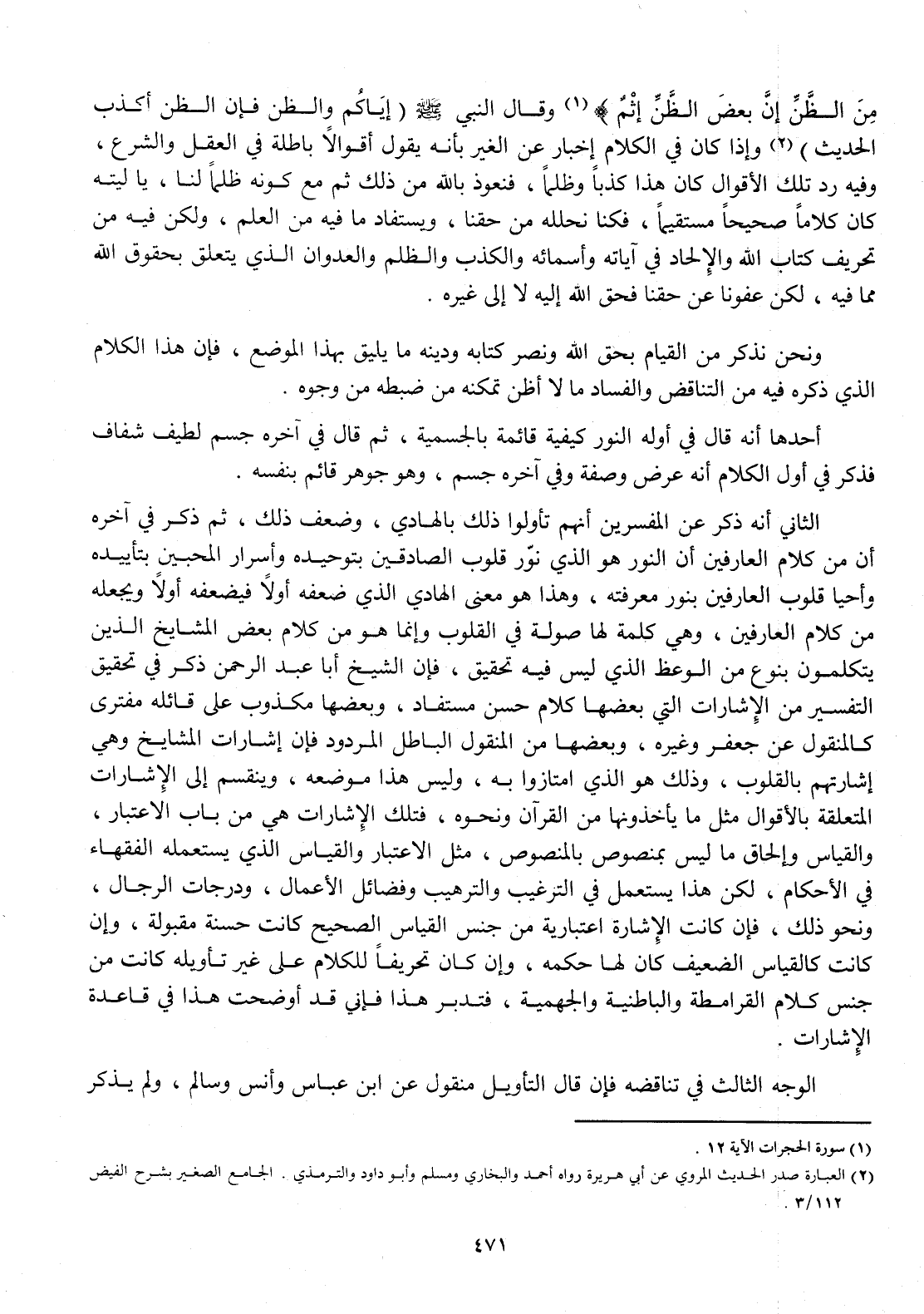 إيَّاكُمْ وَالظَّن فَإِن الظَّن أكذب الحَدِيث وَإِذا كَانَ فِي الْكَلَام إِخْبَار عَن الْغَيْر بِأَنَّهُ يَقُول أقوالا بَاطِلَة فِي الْعقل وَالشَّرْع وَفِيه رد تِلْكَ الْأَقْوَال كَانَ هَذَا كذبا وظلما فنعوذ بِاللَّه من ذَلِك ثمَّ مَعَ كَونه ظلما لنا يَا ليته كَانَ كلَاما صَحِيحا مُسْتَقِيمًا فَكُنَّا نحلله من حَقنا وَيُسْتَفَاد مَا فِيهِ من الْعلم وَلَكِن فِيهِ من تَحْرِيف كتاب الله والإلحاد فِي آيَاته وأسمائه وَالْكذب وَالظُّلم والعدوان الَّذِي يتَعَلَّق بِحُقُوق الله مِمَّا فِيهِ لَكِن عَفَوْنَا عَن حَقنا فَحق الله إِلَيْهِ لَا إِلَى غَيره