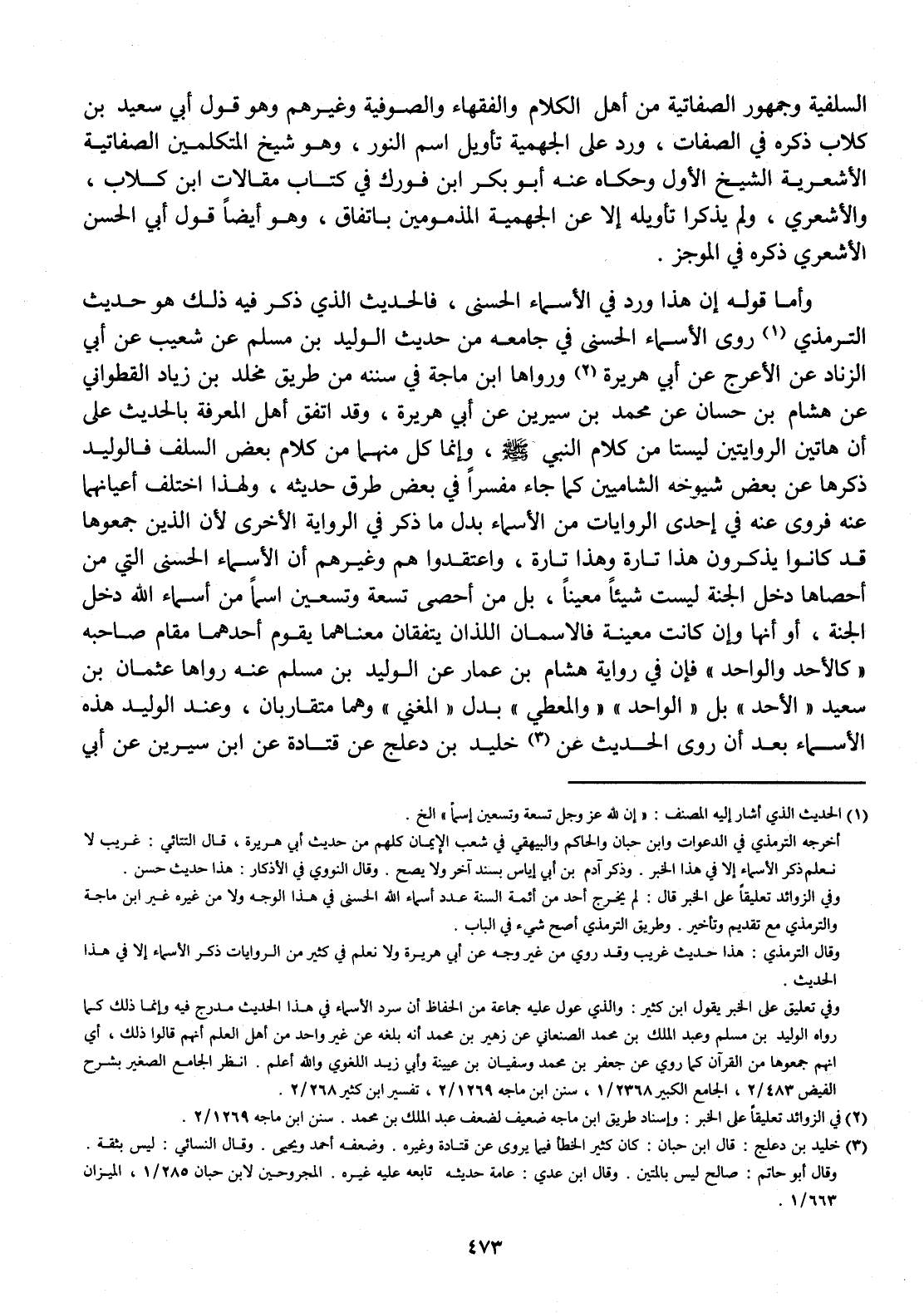 وَأما قَوْله إِن هَذَا ورد فِي الْأَسْمَاء الْحسنى فَالْحَدِيث الَّذِي ذكر فِيهِ ذَلِك هُوَ حَدِيث التِّرْمِذِيّ روى الْأَسْمَاء الْحسنى فِي جَامعه من حَدِيث الْوَلِيد بن مُسلم عَن شُعَيْب عَن أبي الزِّنَاد عَن الْأَعْرَج عَن أبي هُرَيْرَة وَرَوَاهَا ابْن مَاجَه فِي سنَنه من طَرِيق مخلد بن زِيَاد الْقَطوَانِي عَن هِشَام بن حسان عَن مُحَمَّد بن سِيرِين عَن أبي هُرَيْرَة وَقد اتّفق أهل الْمعرفَة بِالْحَدِيثِ على أَن هَاتين الرِّوَايَتَيْنِ ليستا من كَلَام النَّبِي صلى الله عَلَيْهِ وَسلم وَإِنَّمَا كل مِنْهُمَا من كَلَام بعض السّلف فالوليد ذكرهَا عَن بعض شُيُوخه الشاميين كَمَا جَاءَ مُفَسرًا فِي بعض طرق حَدِيثه وَلِهَذَا اخْتلف أعيانهما عَنهُ فروى عَنهُ فِي إِحْدَى الرِّوَايَات من الْأَسْمَاء بدل مَا ذكر فِي الرِّوَايَة الْأُخْرَى لِأَن الَّذين جمعوها قد كَانُوا يذكرُونَ هَذَا تَارَة وَهَذَا تَارَة واعتقدوا هم وَغَيرهم أَن الْأَسْمَاء الْحسنى الَّتِي من أحصاها دخل الْجنَّة لَيست شَيْئا معينا بل من أحصى تِسْعَة وَتِسْعين اسْما من أَسمَاء الله دخل الْجنَّة أَو أَنَّهَا وَإِن كَانَت مُعينَة فالاسمان اللَّذَان يتفقان مَعْنَاهُمَا يقوم أَحدهمَا مقَام صَاحبه كالأحد وَالْوَاحد فَإِن فِي رِوَايَة هِشَام بن عمار عَن الْوَلِيد بن مُسلم عَنهُ رَوَاهَا عُثْمَان بن سعيد الْأَحَد بل الْوَاحِد والمعطي بدل الْمُغنِي وهما متقاربان وَعند الْوَلِيد هَذِه الْأَسْمَاء بعد أَن روى الحَدِيث عَن خُلَيْد بن دعْلج عَن قَتَادَة عَن ابْن سِيرِين عَن أبي