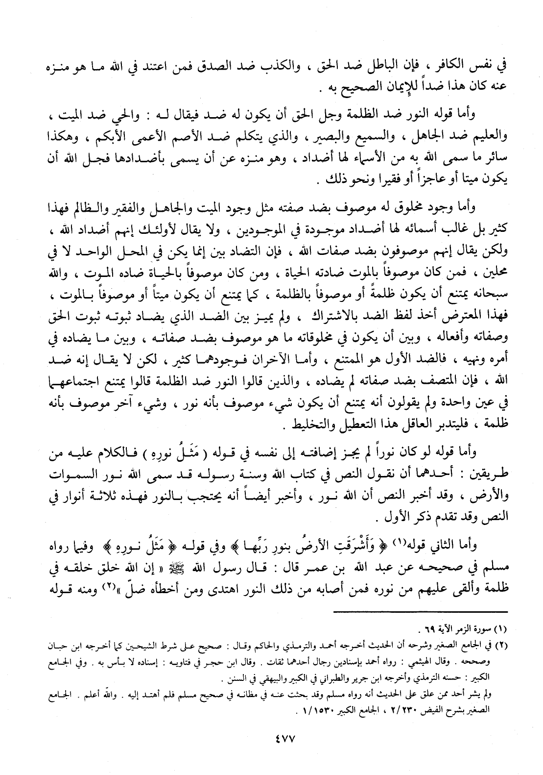 وَأما الثَّانِي قَوْله {وأشرقت الأَرْض بِنور رَبهَا} وَفِي قَوْله {مثل نوره} وَفِيمَا رَوَاهُ مُسلم فِي صَحِيحه عَن عبد الله بن عمر قَالَ قَالَ رَسُول الله صلى الله عَلَيْهِ وَسلم