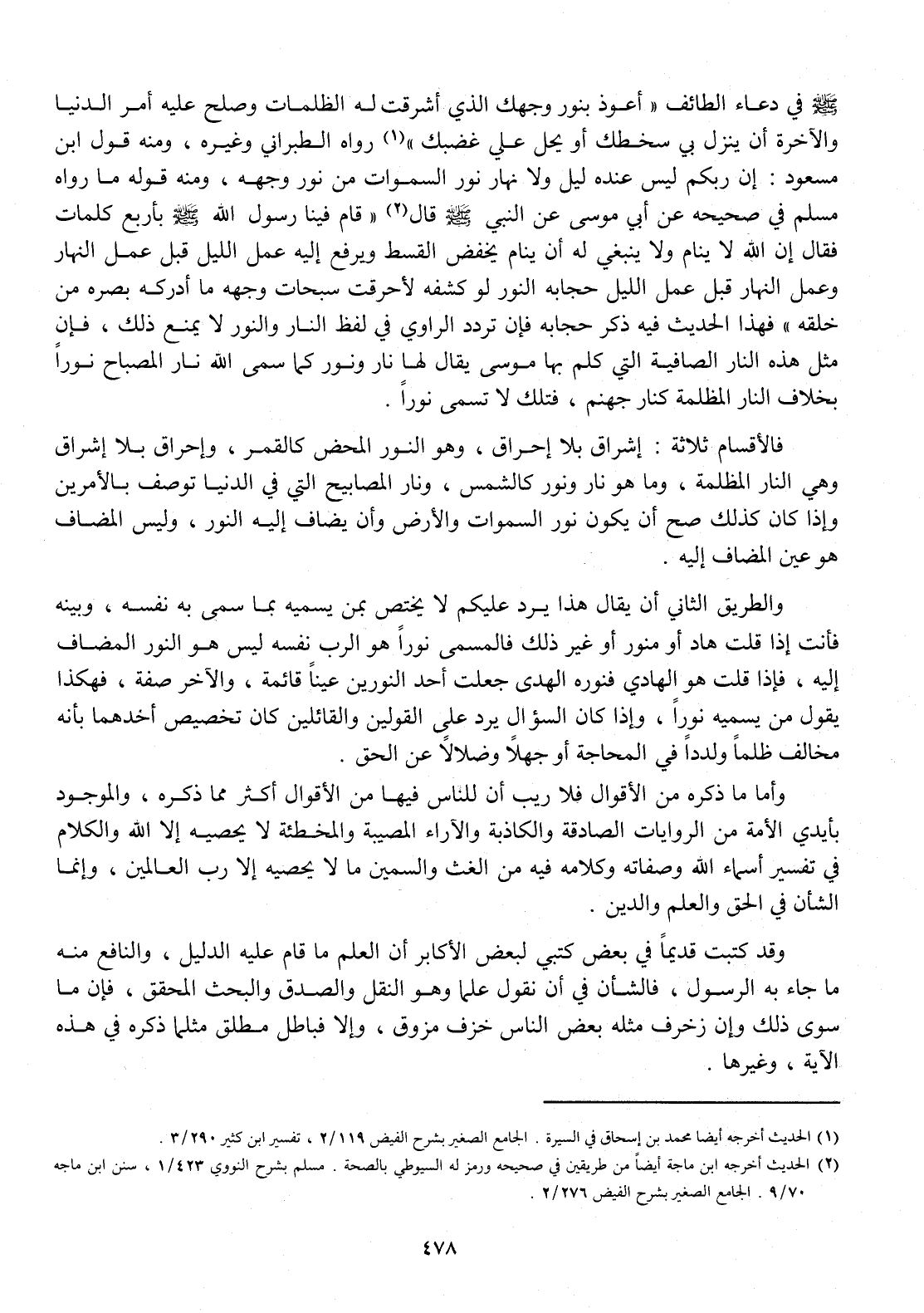 أعوذ بِنور وَجهك الَّذِي أشرقت لَهُ الظُّلُمَات وَصلح عَلَيْهِ أَمر الدُّنْيَا وَالْآخِرَة أَن ينزل بِي سخطك أَو يحل عَليّ غضبك رَوَاهُ الطَّبَرَانِيّ وَغَيره وَمِنْه قَول ابْن مَسْعُود إِن ربكُم لَيْسَ عِنْده ليل وَلَا نَهَار نور السَّمَاوَات من نور وَجهه وَمِنْه قَوْله مَا رَوَاهُ مُسلم فِي صَحِيحه عَن أبي مُوسَى عَن النَّبِي صلى الله عَلَيْهِ وَسلم قَالَ قَامَ فِينَا رَسُول الله صلى الله عَلَيْهِ وَسلم بِأَرْبَع كَلِمَات فَقَالَ إِن الله لَا ينَام وَلَا يَنْبَغِي لَهُ أَن ينَام يخْفض الْقسْط وَيرْفَع إِلَيْهِ عمل اللَّيْل قبل عمل النَّهَار وَعمل النَّهَار قبل عمل اللَّيْل حجابه النُّور لَو كشفه لأحرقت سبحات وَجهه مَا أدْركهُ بَصَره من خلقه فَهَذَا الحَدِيث فِيهِ ذكر حجابه فَإِن تردد الرَّاوِي فِي لفظ النَّار والنور لَا يمْنَع ذَلِك فَإِن مثل هَذِه النَّار الصافية الَّتِي كلم بهَا مُوسَى يُقَال لَهَا نَار وَنور كَمَا سمى الله نَار الْمِصْبَاح نورا بِخِلَاف النَّار الْمظْلمَة كنار جَهَنَّم فَتلك لَا تسمى نورا