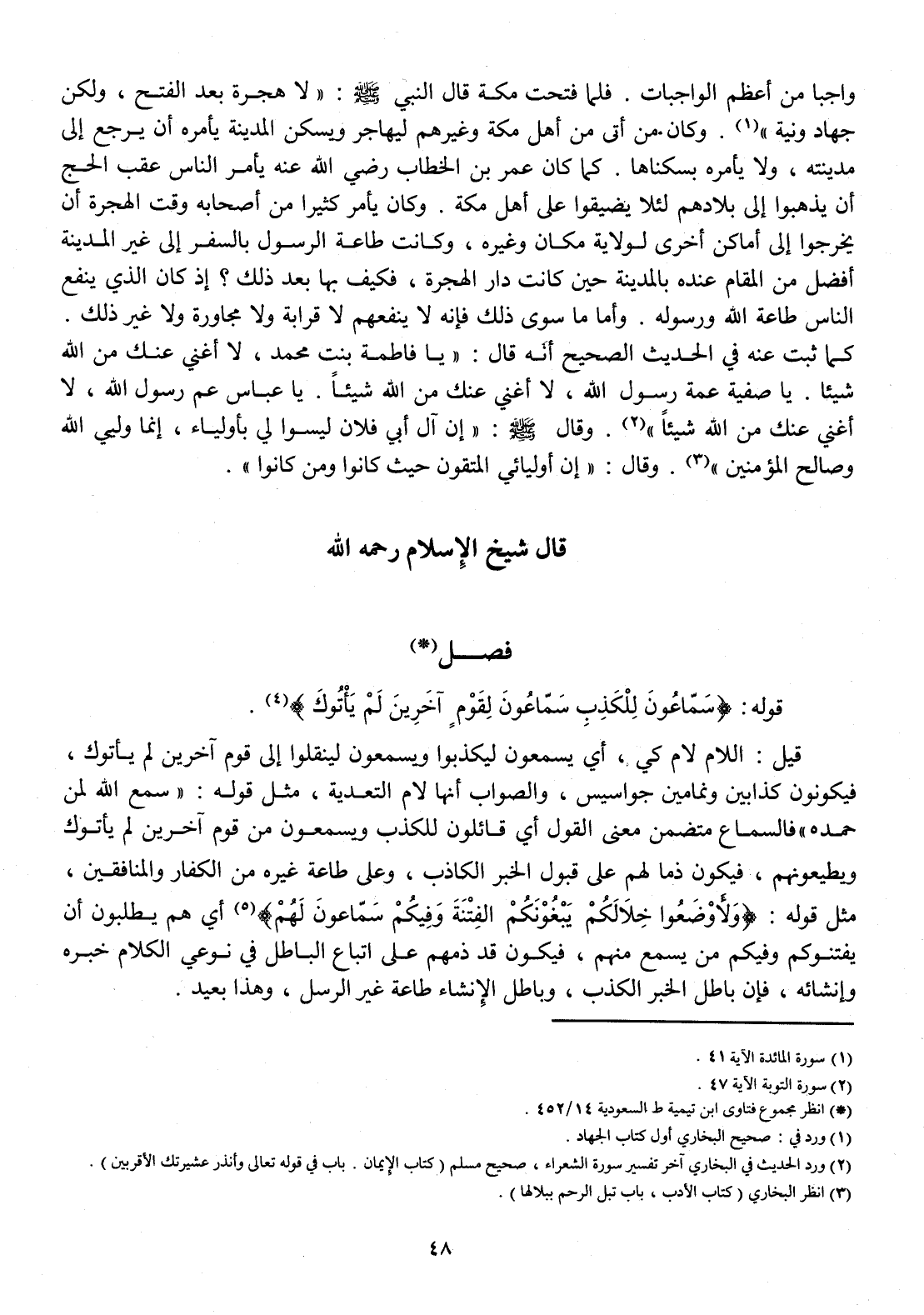 لَا هِجْرَة بعد الْفَتْح وَلَكِن جِهَاد وَنِيَّة وَكَانَ من اتى من اهل مَكَّة وَغَيرهم ليهاجر ويسكن الْمَدِينَة يَأْمُرهُ أَن يرجع إِلَى مدينته وَلَا يَأْمُرهُ بسكناها كَمَا كَانَ عمر بن الْخطاب رَضِي الله عَنهُ يَأْمر النَّاس عقب الْحَج أَن يذهبوا إِلَى بِلَادهمْ لِئَلَّا يضيقوا على أهل مَكَّة وَكَانَ يَأْمر كثيرا من أَصْحَابه وَقت الْهِجْرَة أَن يخرجُوا إِلَى أَمَاكِن أُخْرَى لولاية مَكَان وَغَيره وَكَانَت طَاعَة الرَّسُول بِالسَّفرِ إِلَى غير الْمَدِينَة يخرجُوا إِلَى أَمَاكِن أُخْرَى لولاية مَكَان وَغَيره وَكَانَت طَاعَة الرَّسُول بِالسَّفرِ إِلَى غير الْمَدِينَة أفضل من الْمقَام عِنْده بِالْمَدِينَةِ حِين كَانَت دَار الْهِجْرَة فَكيف بهَا بعد ذَلِك إِذْ كَانَ الَّذِي ينفع النَّاس طَاعَة الله وَرَسُوله وَأما مَا سوى ذَلِك فَإِنَّهُ لَا يَنْفَعهُمْ لَا قرَابَة وَلَا مجاورة وَلَا غير ذَلِك كَمَا ثَبت عَنهُ فِي الحَدِيث الصَّحِيح أَنه قَالَ