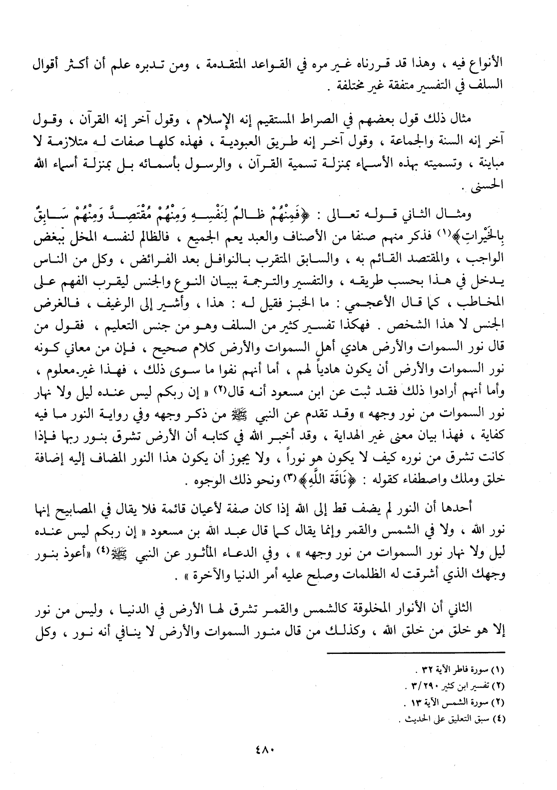 وَمِثَال الثَّانِي قَوْله تَعَالَى {فَمنهمْ ظَالِم لنَفسِهِ وَمِنْهُم مقتصد وَمِنْهُم سَابق بالخيرات} فَذكر مِنْهُم صنفا من الْأَصْنَاف وَالْعَبْد يعم الْجَمِيع فالظالم لنَفسِهِ المخل بِبَعْض الْوَاجِب والمقتصد الْقَائِم بِهِ وَالسَّابِق المتقرب بالنوافل بعد الْفَرَائِض وكل من النَّاس يدْخل فِي هَذَا بِحَسب طَرِيقه وَالتَّفْسِير والترجمة بِبَيَان النَّوْع وَالْجِنْس ليقرب الْفَهم على الْمُخَاطب كَمَا قَالَ الأعجمي مَا الْخبز فَقيل لَهُ هَذَا وأشير إِلَى الرَّغِيف فالغرض الْجِنْس لَا هَذَا الشَّخْص فَهَكَذَا تَفْسِير كثير من السّلف وَهُوَ من جنس التَّعْلِيم فَقَوْل من قَالَ نور السَّمَاوَات وَالْأَرْض هادي أهل السَّمَاوَات وَالْأَرْض كَلَام صَحِيح فَإِن من مَعَاني كَونه نور السَّمَاوَات وَالْأَرْض أَن يكون هاديا لَهُم أما أَنهم نفوا مَا سوى ذَلِك فَهَذَا غير مَعْلُوم وَأما أَنهم أَرَادوا ذَلِك فقد ثَبت عَن ابْن مَسْعُود أَنه قَالَ إِن ربكُم لَيْسَ عِنْده ليل وَلَا نَهَار نور السَّمَاوَات من نور وَجهه وَقد تقدم عَن النَّبِي صلى الله عَلَيْهِ وَسلم من ذكر وَجهه وَفِي رِوَايَة النُّور مَا فِيهِ كِفَايَة فَهَذَا بَيَان معنى غير الْهِدَايَة وَقد أخبر الله فِي كِتَابه أَن الأَرْض تشرق بِنور رَبهَا فَإِذا كَانَت تشرق من نوره كَيفَ لَا يكون هُوَ نورا وَلَا يجوز أَن يكون هَذَا النُّور الْمُضَاف إِلَيْهِ إِضَافَة خلق وَملك واصطفاء كَقَوْلِه {نَاقَة الله} وَنَحْو ذَلِك من الْوُجُوه