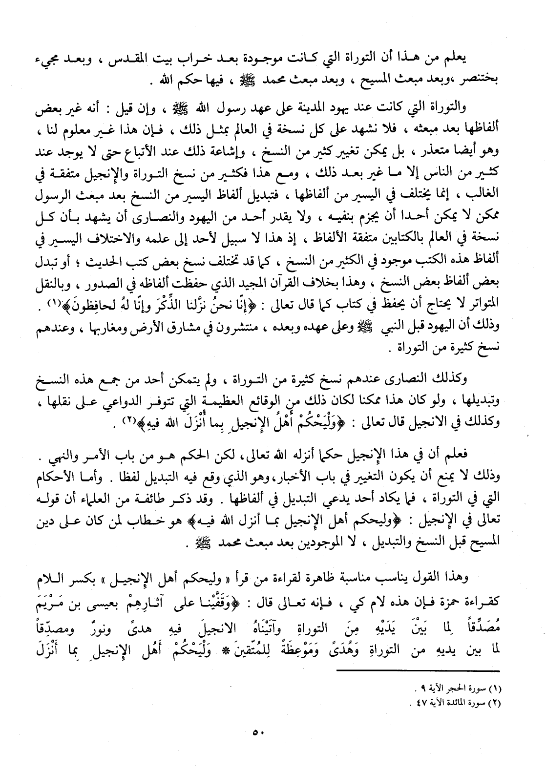 فَعلم أَن فِي هَذَا الْإِنْجِيل حكما أنزلهُ الله تَعَالَى لَكِن الحكم هُوَ من بَاب الْأَمر وَالنَّهْي وَذَلِكَ لَا يمْنَع أَن يكون التَّغْيِير فِي بَاب الْأَخْبَار وَهُوَ الَّذِي وَقع فِيهِ التبديل لفظا وَأما الْأَحْكَام الَّتِي فِي التَّوْرَاة فَمَا يكَاد أحد يَدعِي التبديل فِي ألفاظها وَقد ذكر طَائِفَة من الْعلمَاء أَن قَوْله تَعَالَى فِي الْإِنْجِيل {وليحكم أهل الْإِنْجِيل بِمَا أنزل الله فِيهِ} هُوَ خطاب لمن كَانَ على دين الْمَسِيح قبل النّسخ والتبديل لَا الْمَوْجُودين بعد مبعث مُحَمَّد صلى الله عَلَيْهِ وَسلم