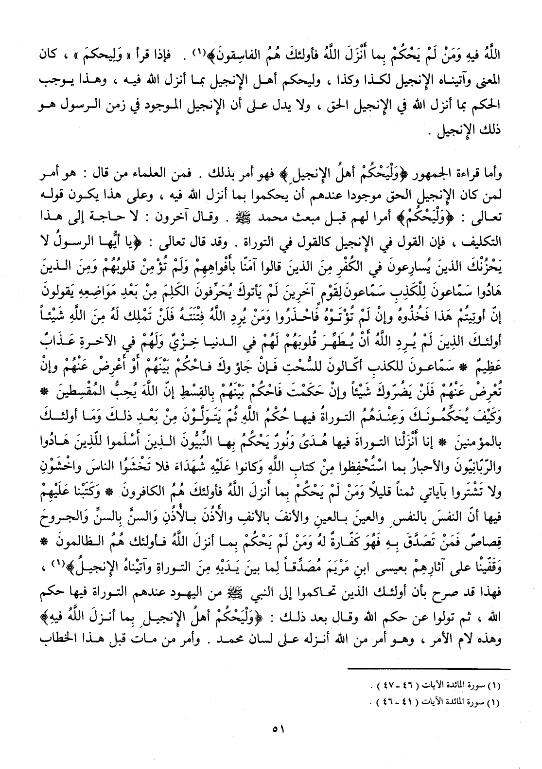 وَأما قِرَاءَة الْجُمْهُور {وليحكم أهل الْإِنْجِيل} فَهُوَ أَمر بذلك فَمن الْعلمَاء من قَالَ هُوَ أَمر لمن كَانَ الْإِنْجِيل الْحق مَوْجُودا عِنْدهم أَن يحكموا بِمَا أنزل الله فِيهِ وعَلى هَذَا يكون قَوْله تَعَالَى {وليحكم} أمرا لَهُم قبل مبعث مُحَمَّد صلى الله عَلَيْهِ وَسلم وَقَالَ آخَرُونَ لَا حَاجَة إِلَى هَذَا التَّكْلِيف فَإِن القَوْل فِي الْإِنْجِيل كالقول فِي التَّوْرَاة وَقد قَالَ تَعَالَى {يَا أَيهَا الرَّسُول لَا يحزنك الَّذين يُسَارِعُونَ فِي الْكفْر من الَّذين قَالُوا آمنا بأفواههم وَلم تؤمن قُلُوبهم وَمن الَّذين هادوا سماعون للكذب سماعون لقوم آخَرين لم يأتوك يحرفُونَ الْكَلم من بعد موَاضعه يَقُولُونَ إِن أُوتِيتُمْ هَذَا فَخُذُوهُ وَإِن لم تؤتوه فاحذروا وَمن يرد الله فتنته فَلَنْ تملك لَهُ من الله شَيْئا أُولَئِكَ الَّذين لم يرد الله أَن يطهر قُلُوبهم لَهُم فِي الدُّنْيَا خزي وَلَهُم فِي الْآخِرَة عَذَاب عَظِيم سماعون للكذب أكالون للسحت فَإِن جاؤوك فاحكم بَينهم أَو أعرض عَنْهُم وَإِن تعرض عَنْهُم فَلَنْ يضروك شَيْئا وَإِن حكمت فاحكم بَينهم بِالْقِسْطِ إِن الله يحب المقسطين وَكَيف يحكمونك وَعِنْدهم التَّوْرَاة فِيهَا حكم الله ثمَّ يتولون من بعد ذَلِك وَمَا أُولَئِكَ بِالْمُؤْمِنِينَ إِنَّا أنزلنَا التَّوْرَاة فِيهَا هدى وَنور يحكم بهَا النَّبِيُّونَ الَّذين أَسْلمُوا للَّذين هادوا والربانيون والأحبار بِمَا استحفظوا من كتاب الله وَكَانُوا عَلَيْهِ شُهَدَاء فَلَا تخشوا النَّاس واخشون وَلَا تشتروا بآياتي ثمنا قَلِيلا وَمن لم يحكم بِمَا أنزل الله فَأُولَئِك هم الْكَافِرُونَ وكتبنا عَلَيْهِم فِيهَا أَن النَّفس بِالنَّفسِ وَالْعين بِالْعينِ وَالْأنف بالأنف وَالْأُذن بالأذن وَالسّن بِالسِّنِّ والجروح قصاص فَمن تصدق بِهِ فَهُوَ كَفَّارَة لَهُ وَمن لم يحكم بِمَا أنزل الله فَأُولَئِك هم الظَّالِمُونَ وقفينا على آثَارهم بِعِيسَى ابْن مَرْيَم مُصدقا لما بَين يَدَيْهِ من التَّوْرَاة وَآتَيْنَاهُ الْإِنْجِيل} فَهَذَا قد صرح بِأَن أُولَئِكَ الَّذين تحاكموا إِلَى النَّبِي صلى الله عَلَيْهِ وَسلم من الْيَهُود عِنْدهم التَّوْرَاة فِيهَا حكم الله ثمَّ توَلّوا عَن حكم الله وَقَالَ بعد ذَلِك {وليحكم أهل الْإِنْجِيل بِمَا أنزل الله فِيهِ} وَهَذِه لَام الْأَمر وَهُوَ أَمر من الله أنزلهُ على لِسَان مُحَمَّد وَأمر من مَاتَ قبل هَذَا الْخطاب