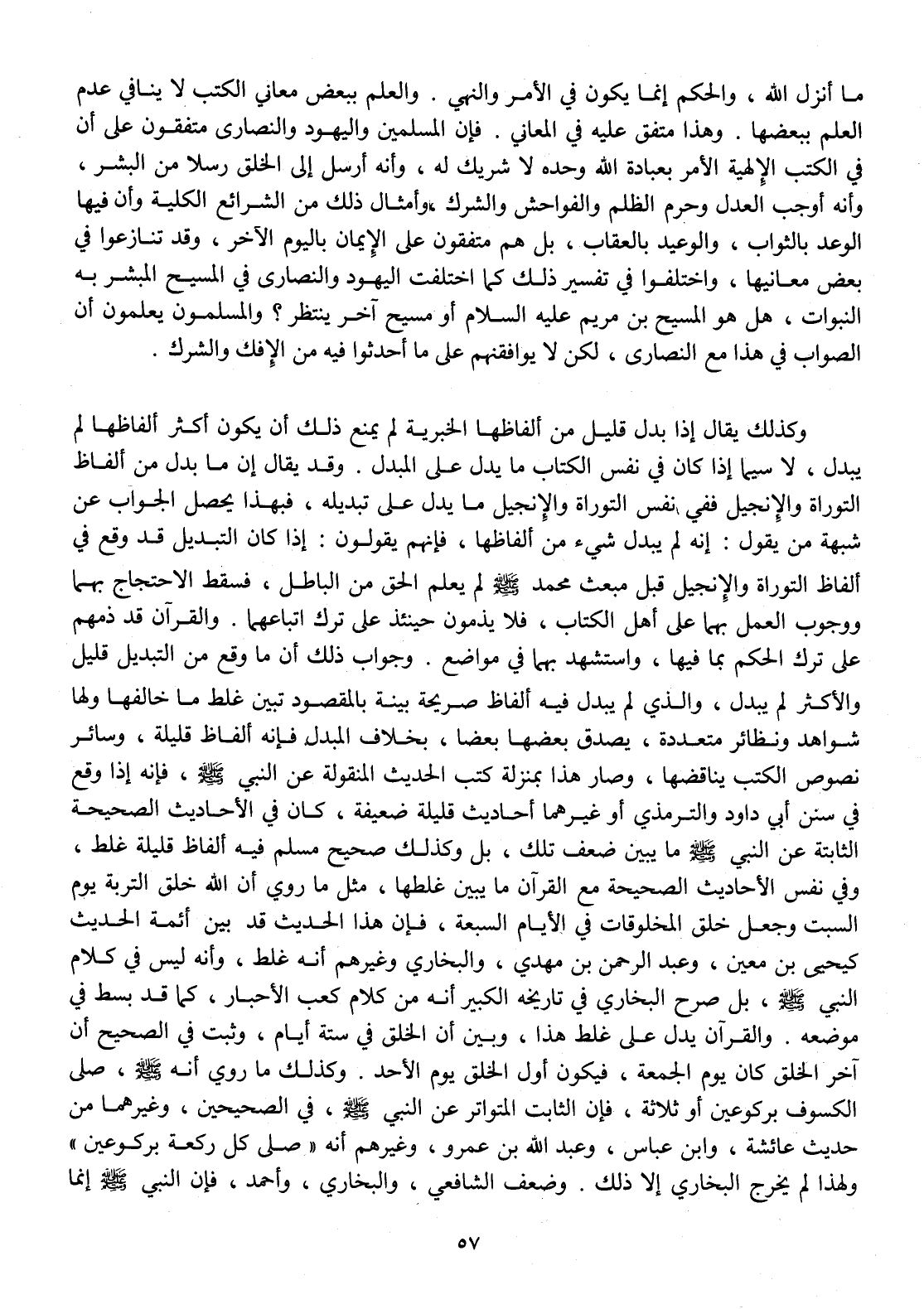 وَكَذَلِكَ يُقَال إِذا بدل قَلِيل من ألفاظها الخبرية لم يمْنَع ذَلِك أَن يكون أَكثر ألفاظها لم يُبدل لَا سِيمَا إِذا كَانَ فِي نفس الْكتاب مَا يدل على الْمُبدل وَقد يُقَال إِن مَا بدل من أَلْفَاظ التَّوْرَاة وَالْإِنْجِيل فَفِي نفس التَّوْرَاة وَالْإِنْجِيل مَا يدل على تبديله فَبِهَذَا يحصل الْجَواب على شُبْهَة عَن يَقُول إِنَّه لم يُبدل شَيْء من ألفاظها فَإِنَّهُم يَقُولُونَ إِذا كَانَ التبديل قد وَقع فِي أَلْفَاظ التَّوْرَاة وَالْإِنْجِيل قبل مبعث مُحَمَّد صلى الله عَلَيْهِ وَسلم لم يعلم الْحق من الْبَاطِل فَسقط الِاحْتِجَاج بهما وَوُجُوب الْعَمَل بهما على أهل الْكتاب فَلَا يذمون حِينَئِذٍ على ترك اتباعهما وَالْقُرْآن قد ذمهم على ترك الحكم بِمَا فِيهَا وَاسْتشْهدَ بهما فِي مَوَاضِع وَجَوَاب ذَلِك أَن ماوقع من التبديل قَلِيل وَالْأَكْثَر لم يُبدل وَالَّذِي لم يُبدل فِيهِ أَلْفَاظ صَرِيحَة بَيِّنَة بِالْمَقْصُودِ تبين غلط مَا خالفها وَلها شَوَاهِد ونظائر مُتعَدِّدَة يصدق بَعْضهَا بَعْضًا بِخِلَاف الْمُبدل فَإِنَّهُ أَلْفَاظ قَليلَة وَسَائِر نُصُوص الْكتب يناقضها وَصَارَ هَذَا بِمَنْزِلَة كتب الحَدِيث المنقولة عَن النَّبِي صلى الله عَلَيْهِ وَسلم فَإِنَّهُ إِذا وَقع فِي سنَن أبي دَاوُد وَالتِّرْمِذِيّ أَو غَيرهمَا أَحَادِيث قَليلَة ضَعِيفَة كَانَ فِي الْأَحَادِيث الصَّحِيحَة الثَّابِتَة عَن النَّبِي صلى الله عَلَيْهِ وَسلم مَا يبين ضعف تِلْكَ بل وَكَذَلِكَ صَحِيح مُسلم فِيهِ أَلْفَاظ قَليلَة غلط وَفِي نفس الْأَحَادِيث الصَّحِيحَة مَعَ الْقُرْآن مَا يبين غلطها مثل مَا رُوِيَ أَن الله خلق التربة يَوْم السبت وَجعل خلق الْمَخْلُوقَات فِي الْأَيَّام السَّبْعَة فَإِن هَذَا الحَدِيث قد بَين أَئِمَّة الحَدِيث كيحيى بن معِين وَعبد الرَّحْمَن بن مهْدي وَالْبُخَارِيّ وَغَيرهم أَنه غلط وَأَنه لَيْسَ فِي كَلَام النَّبِي صلى الله عَلَيْهِ وَسلم بل صرح البُخَارِيّ فِي تَارِيخه الْكَبِير أَنه من كَلَام كَعْب الْأَحْبَار كَمَا قد بسط فِي مَوْضِعه وَالْقُرْآن يدل على غلط هَذَا وَبَين أَن الْخلق فِي سِتَّة أَيَّام وَثَبت فِي الصَّحِيح أَن آخر الْخلق كَانَ يَوْم الْجُمُعَة فَيكون أول الْخلق يَوْم الْأَحَد وَكَذَلِكَ مَا رُوِيَ أَنه صلى الله عَلَيْهِ وَسلم صلى الْكُسُوف بركوعين أَو ثَلَاثَة فَإِن الثَّابِت الْمُتَوَاتر عَن النَّبِي صلى الله عَلَيْهِ وَسلم فِي الصَّحِيحَيْنِ وَغَيرهمَا من حَدِيث عَائِشَة وَابْن عَبَّاس وَعبد الله بن عَمْرو وَغَيرهم أَنه صلى كل رَكْعَة بركوعين وَلِهَذَا لم يخرج البُخَارِيّ إِلَّا ذَلِك وَضعف الشَّامي وَالْبُخَارِيّ وَأحمد فَإِن النَّبِي صلى الله عَلَيْهِ وَسلم إِنَّمَا