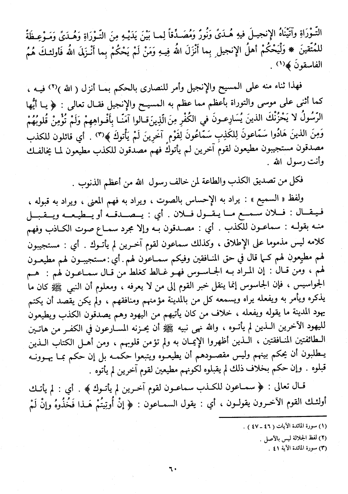 فَهَذَا ثَنَاء مِنْهُ على الْمَسِيح وَالْإِنْجِيل وَأمر لِلنَّصَارَى بالحكم بِمَا أنزل الله فِيهِ كَمَا أثنى على مُوسَى والتوراة بأعظم مِمَّا عظم بِهِ الْمَسِيح وَالْإِنْجِيل فَقَالَ تَعَالَى {يَا أَيهَا الرَّسُول لَا يحزنك الَّذين يُسَارِعُونَ فِي الْكفْر من الَّذين قَالُوا آمنا بأفواههم وَلم تؤمن قُلُوبهم وَمن الَّذين هادوا سماعون للكذب سماعون لقوم آخَرين لم يأتوك} أَي قَائِلُونَ للكذب مصدقون مستجيبون مطيعون لقوم آخَرين لم يأتوك فهم مصدقون للكذب مطيعون لما يخالفك وَأَنت رَسُول الله