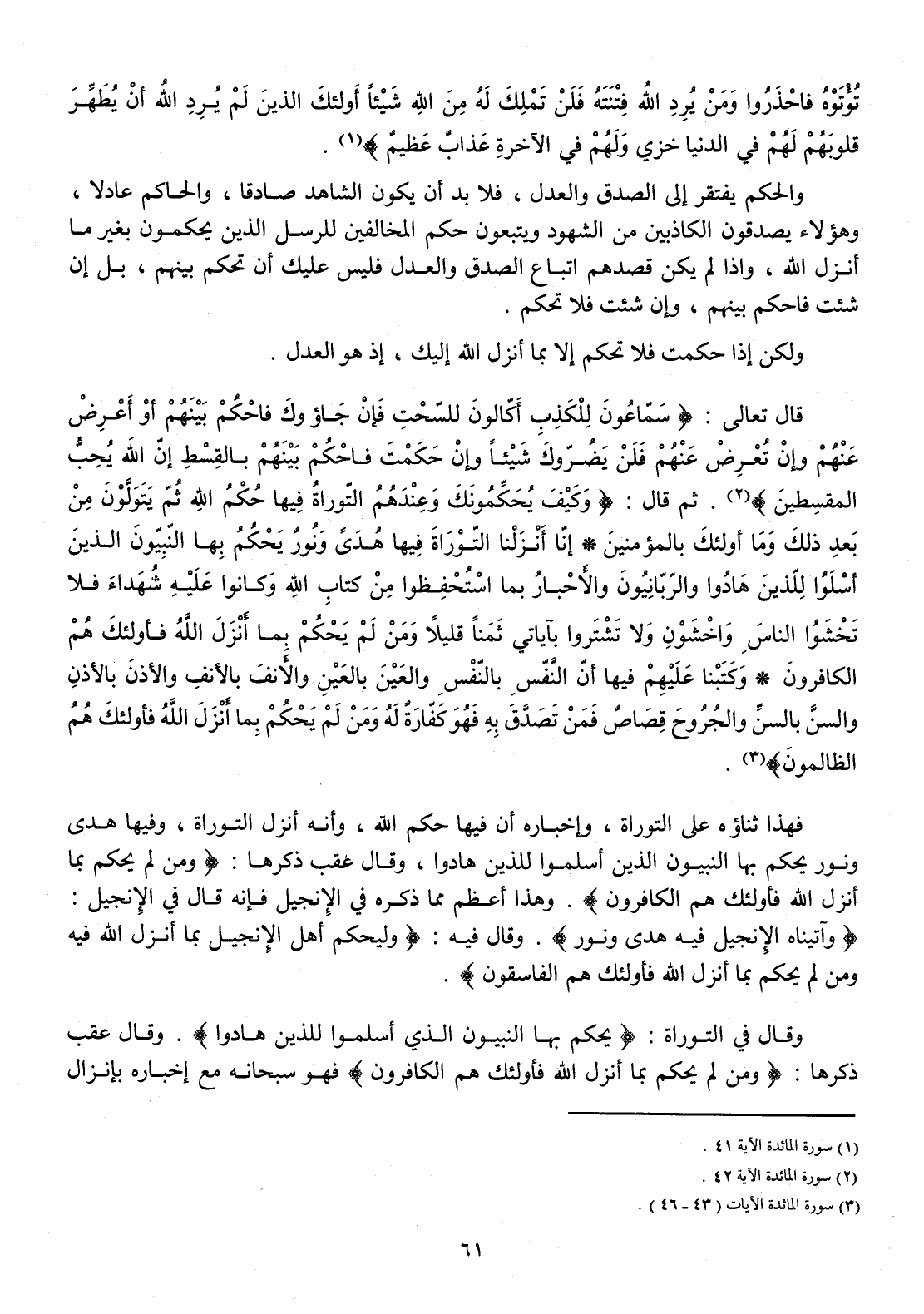 قَالَ تَعَالَى {سماعون للكذب أكالون للسحت فَإِن جاؤوك فاحكم بَينهم أَو أعرض عَنْهُم وَإِن تعرض عَنْهُم فَلَنْ يضروك شَيْئا وَإِن حكمت فاحكم بَينهم بِالْقِسْطِ إِن الله يحب المقسطين} ثمَّ قَالَ سُورَة الْمَائِدَة الْآيَات 43 46