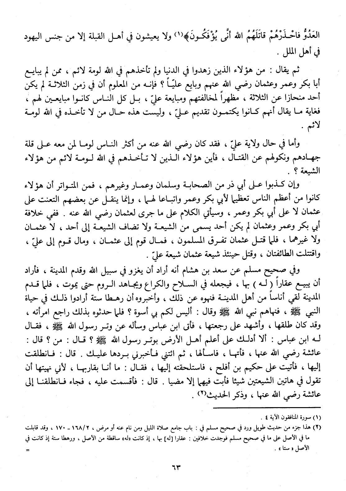 ثمَّ يُقَال من هَؤُلَاءِ الَّذين زهدوا فِي الدُّنْيَا وَلم تأخذهم فِي الله لومة لائم مِمَّن لم يُبَايع أَبَا بكر وَعمر وَعُثْمَان رَضِي الله عَنْهُم وَبَايع عليا فَإِنَّهُ من الْمَعْلُوم أَن فِي زمن الثَّلَاثَة لم يكن أحد منحازا عَن الثَّلَاثَة مظْهرا لمخالفتهم ومبايعة عَليّ بل كل النَّاس كَانُوا مبايعين لَهُم فغاية مَا يُقَال أَنهم كَانُوا يكتمون تَقْدِيم عَليّ وَلَيْسَت هَذِه حَال من لَا تَأْخُذهُ فِي الله لومة لائم