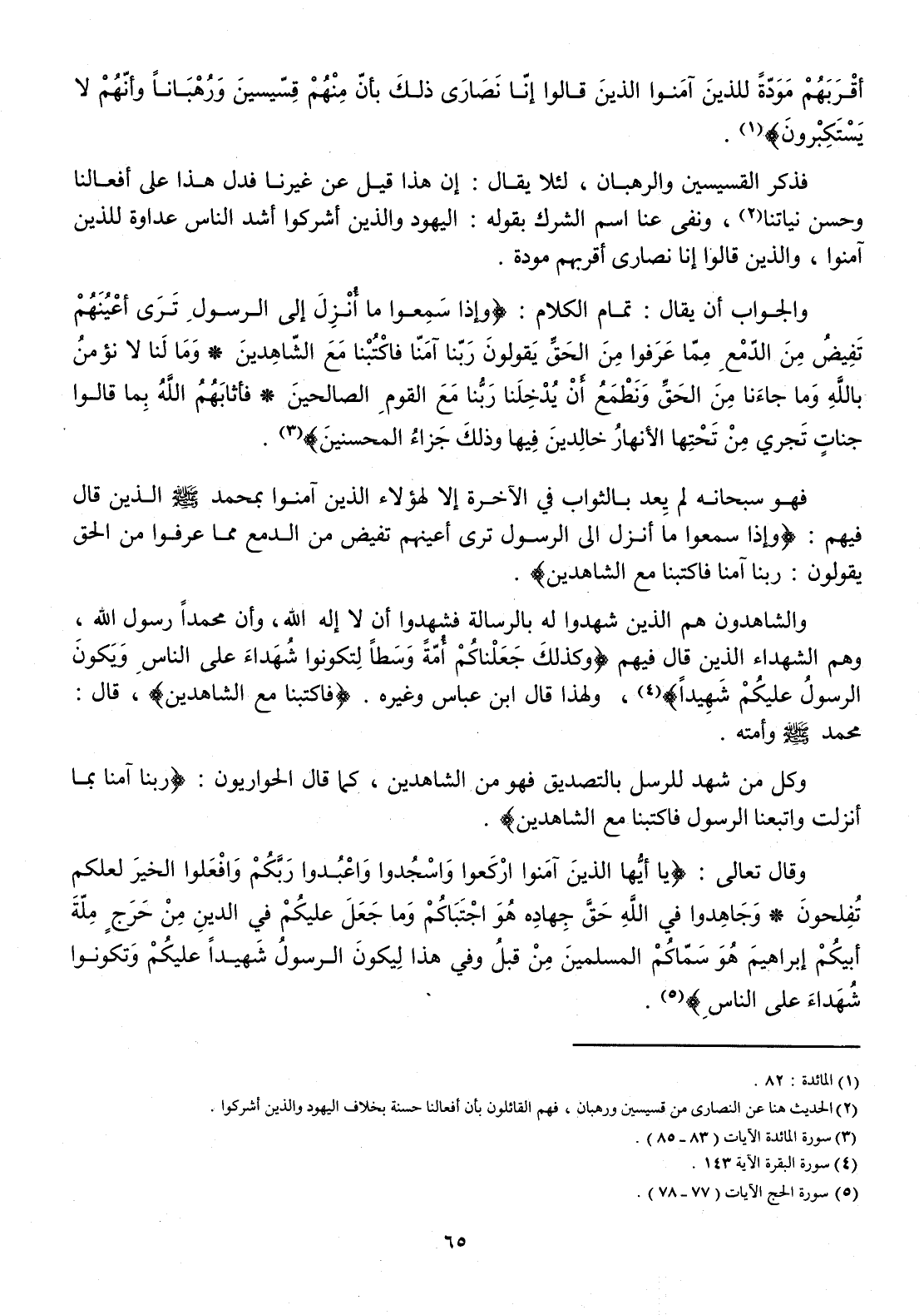 فَذكر القسيسين والرهبان لِئَلَّا يُقَال إِن هَذَا قيل عَن غَيرنَا فَدلَّ هَذَا على أفعالنا وَحسن نياتنا وَنفى عَنَّا اسْم الشّرك بقوله الْيَهُود وَالَّذين أشركوا أَشد النَّاس عَدَاوَة للَّذين آمنُوا وَالَّذين قَالُوا إِنَّا نَصَارَى أقربهم مَوَدَّة