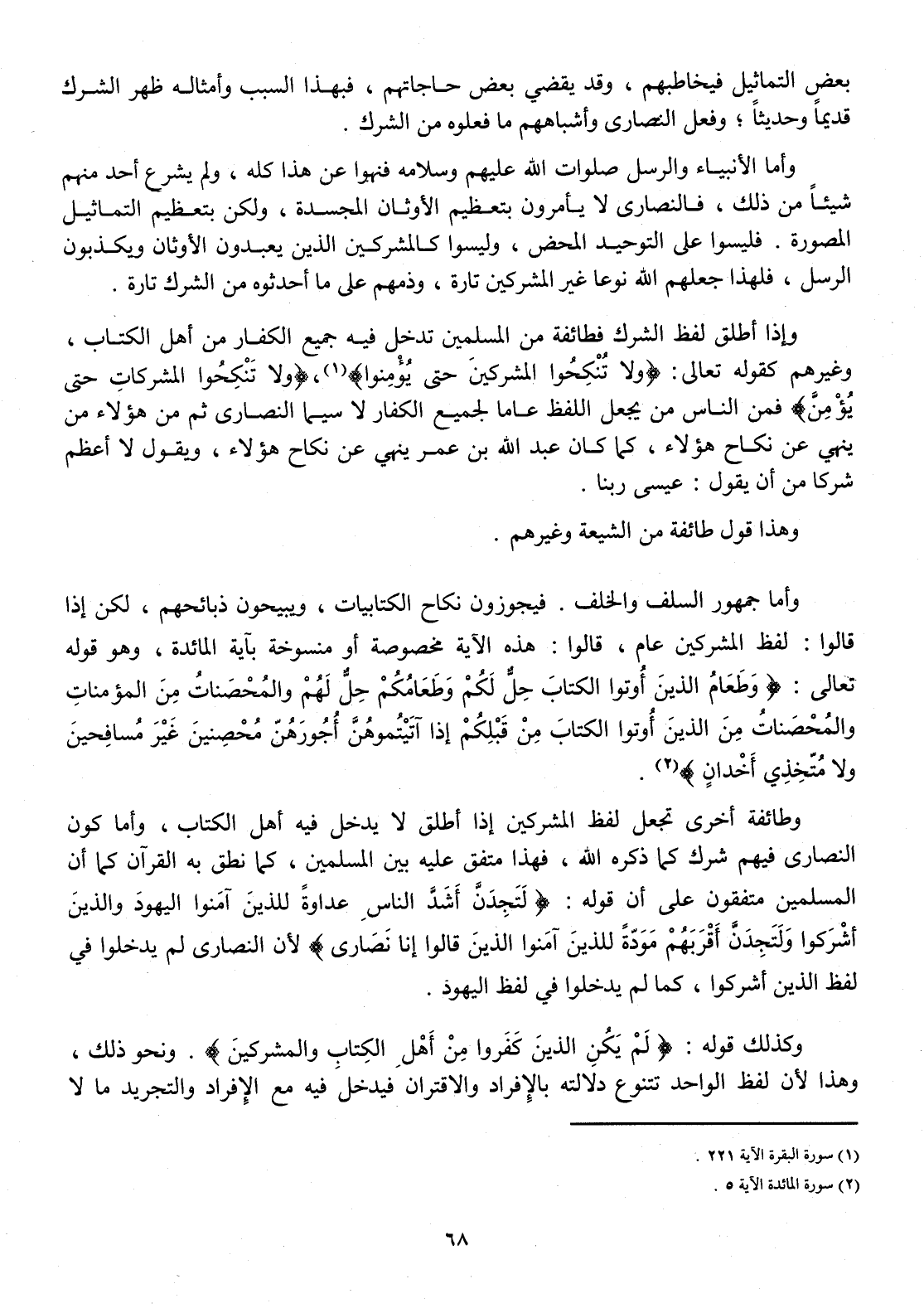 وَإِذا أطلق لفظ الشّرك فطائفة من الْمُسلمين تدخل فِيهِ جَمِيع الْكفَّار من أهل الْكتاب وَغَيرهم كَقَوْلِه تَعَالَى {وَلَا تنْكِحُوا الْمُشْركين حَتَّى يُؤمنُوا} {وَلَا تنْكِحُوا المشركات حَتَّى يُؤمن} فَمن النَّاس من يَجْعَل اللَّفْظ عَاما لجَمِيع الْكفَّار لَا سِيمَا النَّصَارَى ثمَّ من هَؤُلَاءِ من ينْهَى عَن نِكَاح هَؤُلَاءِ كَمَا كَانَ عبد الله بن عمر يُنْهِي عَن نِكَاح هَؤُلَاءِ وَيَقُول لاأعظم شركا من أَن يَقُول عِيسَى رَبنَا