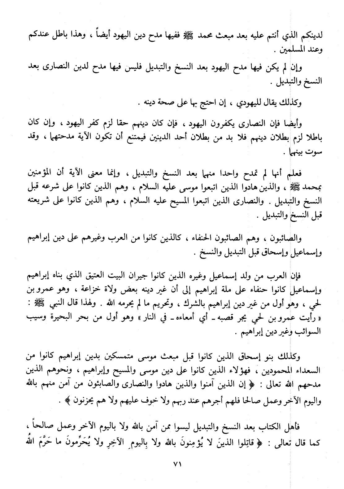 فَعلم أَنَّهَا لم تمدح وَاحِدًا مِنْهُمَا بعد النّسخ والتبديل وَإِنَّمَا معنى الْآيَة أَن الْمُؤمنِينَ بِمُحَمد صلى الله عَلَيْهِ وَسلم وَالَّذين هادوا الَّذين اتبعُوا مُوسَى عَلَيْهِ السَّلَام وهم الَّذين كَانُوا على شرعة قبل النّسخ والتبديل وَالنَّصَارَى الَّذين اتبعُوا الْمَسِيح عَلَيْهِ السَّلَام وهم الَّذين كَانُوا على شَرِيعَته قبل النّسخ والتبديل