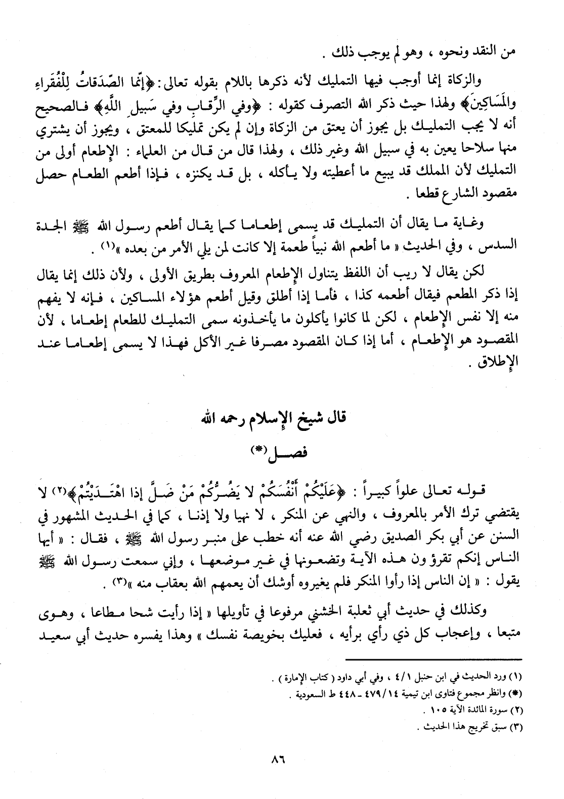 وَالزَّكَاة إِنَّمَا أوجب فِيهَا التَّمْلِيك لِأَنَّهُ ذكرهَا بِاللَّامِ بقوله تَعَالَى {إِنَّمَا الصَّدقَات للْفُقَرَاء وَالْمَسَاكِين} وَلِهَذَا حَيْثُ ذكر الله التَّصَرُّف كَقَوْلِه {وَفِي الرّقاب والغارمين وَفِي سَبِيل الله} فَالصَّحِيح أَنه لَا يجب التَّمْلِيك بل يجوز أَن يعْتق من الزَّكَاة وَإِن لم يكن تَمْلِيكًا للْمُعْتق وَيجوز أَن يَشْتَرِي مِنْهَا سِلَاحا يعين بِهِ فِي سَبِيل الله وَغير ذَلِك وَلِهَذَا قَالَ من قَالَ من الْعلمَاء الْإِطْعَام أولى من التَّمْلِيك لِأَن المملك قد يَبِيع مَا أَعْطيته وَلَا يَأْكُلهُ بل قد يكنزه فَإِذا أطْعم الطَّعَام حصل مَقْصُود الشَّارِع قطعا