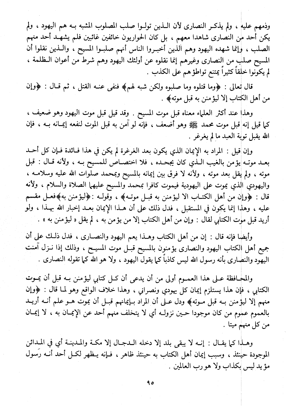 وَأَيْضًا فَإِنَّهُ قَالَ إِن من أهل الْكتاب وَهَذَا يعم الْيَهُود وَالنَّصَارَى فَدلَّ ذَلِك على أَن جَمِيع أهل الْكتاب الْيَهُود وَالنَّصَارَى يُؤمنُونَ بالمسيح قبل موت الْمَسِيح وَذَلِكَ إِذا نزل آمَنت الْيَهُود وَالنَّصَارَى بِأَنَّهُ رَسُول الله لَيْسَ كَاذِبًا كَمَا يَقُول الْيَهُود وَلَا هُوَ الله كَمَا تَقوله النَّصَارَى