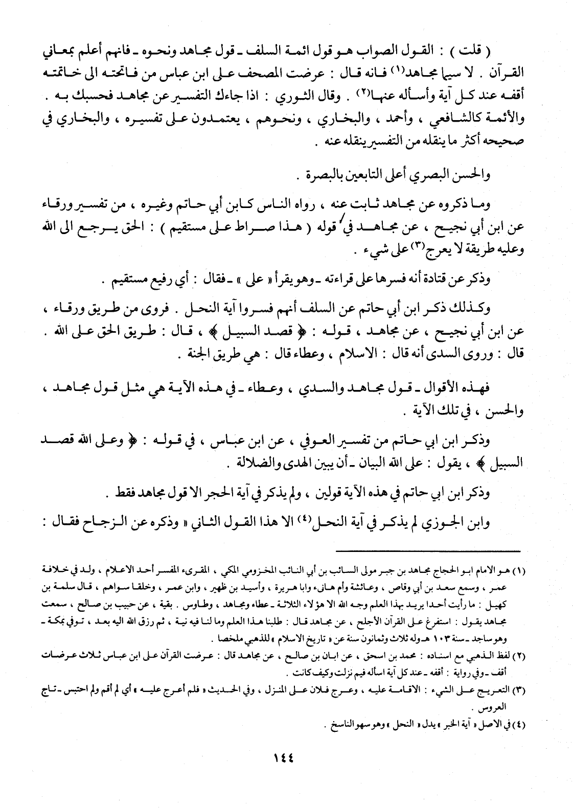 (قلت) القَوْل الصَّوَاب هُوَ قَول أَئِمَّة السّلف قَول مُجَاهِد وَنَحْوه فَإِنَّهُم أعلم بمعاني الْقُرْآن لَا سِيمَا مُجَاهِد فَإِنَّهُ قَالَ عرضت الْمُصحف على ابْن عَبَّاس من فاتحته إِلَى خاتمته أقفه عِنْد كل آيَة وأسأله عَنْهَا وَقَالَ الثَّوْريّ إِذا جَاءَك التَّفْسِير عَن مُجَاهِد فحسبك بِهِ وَالْأَئِمَّة كالشافعي وَأحمد وَالْبُخَارِيّ وَنَحْوهم يعتمدون على تَفْسِيره وَالْبُخَارِيّ فِي صَحِيحَة أَكثر مَا يَنْقُلهُ من التَّفْسِير يَنْقُلهُ عَنهُ